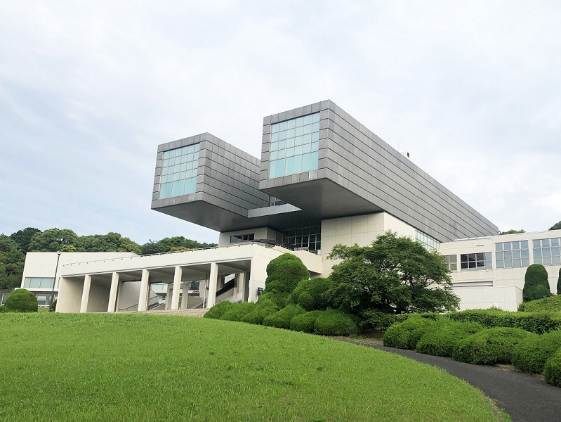 | 写真は福岡県にある、北九州市立美術館です。何の形に見えますか?私にはところてんを押し出す器械が2個並んでいるように見えたのですが、愛称は「丘の上の双眼鏡」だそうです。高台に位置しており、まさに双眼鏡を覗いたような見晴らしの良さです。 |