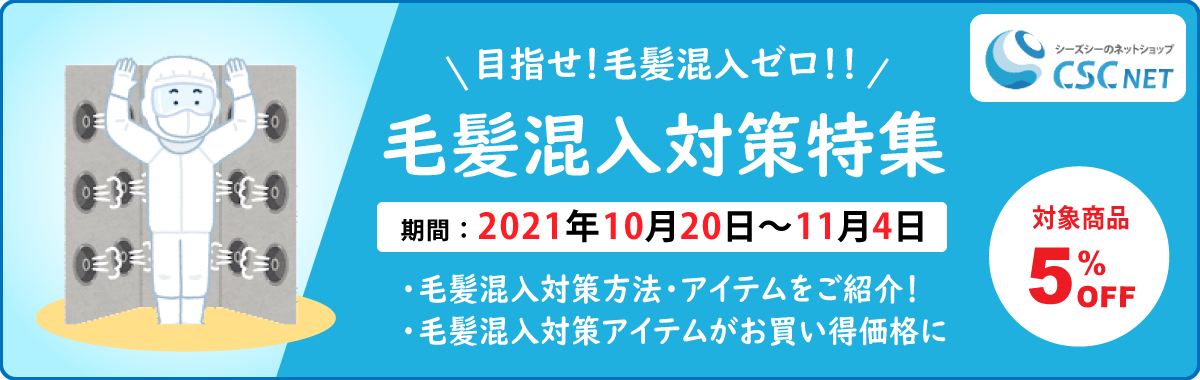 ![]() シーズシーのネットショップCSC NET(シーズシーネット)では、 「目指せ!毛髪混入ゼロ!!毛髪混入対策特集」を開催中です! 毛髪混入にお困りの会員様必見の毛髪アイテムをご紹介しております。 今なら対象商品が5%OFF!! 11/4迄なので、まだチェックしていない人は急いでバナーをクリック! |