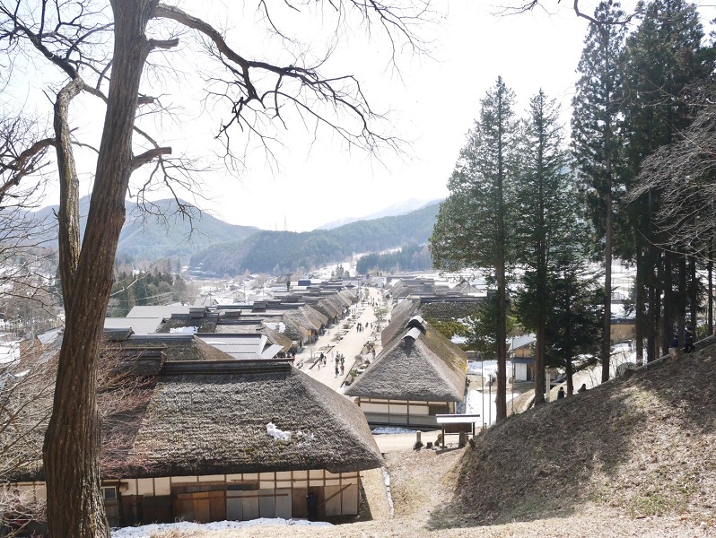 写真は福島県で有名な観光地である大内宿(おおうちじゅく)です。 江戸時代の茅葺屋根が軒を連ねる宿場町です。現在は飲食店やお土産屋さんになっており、 そばの器の上に1本のねぎを丸ごと乗せた「ねぎそば」が名物です。 箸を使わずにねぎで食べるそうなのですが、これがなかなか難しいです。 機会があれば試してみてください。 |