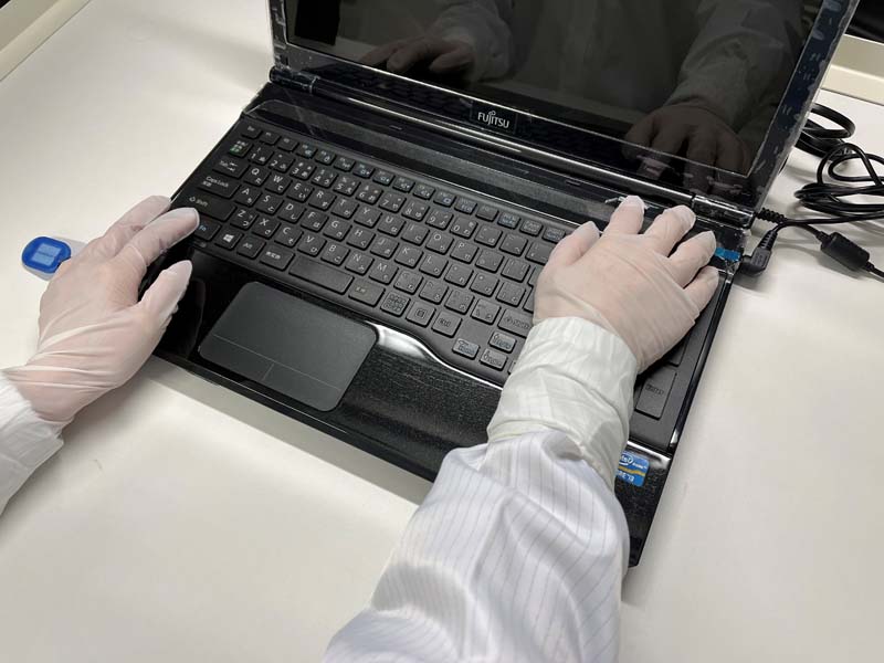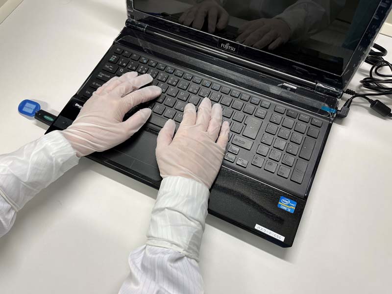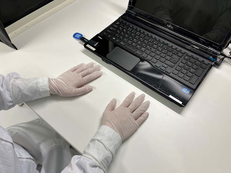 | 【パターン1】 コットンリンタ(仮想異物)を手袋に付けて、ハンドクリーナーせず、基本動作を行う。 【パターン2】 コットンリンタ(仮想異物)を手袋に付けて、基本動作1~4ごとに粘着ローラーを1回握り、ハンドクリーナーする 。 |