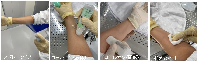 | 【実験方法】 1)脇に見立てた腕の内側にシリコンウエハを3秒押し当て、制汗剤を塗布していな い状態を粗大粒子カウンター「RACCAR」にて測定する 2)4種類の制汗剤をそれぞれ脇に見立てた腕の内側に塗布し5秒おく ※写真1参照 その後、4種類の制汗剤で下記STEP1~STEP4までの同じ動作を行う ※写真2参照 STEP1. 制汗剤を塗布(スプレー)し、5秒放置 STEP2. 制汗剤を塗布(スプレー)した箇所にウエア生地を3秒押し当てる STEP3. ウエア生地をシリコンウエハに転写する STEP4. シリコンウエハを粗大粒子カウンター「RACCAR」で測定する ※実験時、制汗剤を塗布(スプレー)後はアルコールにて肌を洗浄し、5分放置 ※ウエアサンプル生地に転写時は全て卓上クリーンベンチ内で作業 ※スプレーはメーカー推奨の10cm離れたところからスプレー |