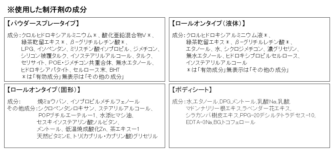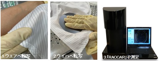 | 【使用機器類】 《制汗剤4タイプ》 ・スプレータイプ ・ロールオンタイプ(液体) ・ロールオンタイプ(固形) ・ボディシート ※成分表は こちらから ・粗大粒子カウンター「RACCAR」 ・サンプル採取板「シリコンウエハ」 ・専用ピンセット ・ワイパー(型式:LTK3000E)※ウエハ洗浄用 ・エタノール※ウエハ洗浄用 ・クリーンウエアサンプル生地※転写用 |