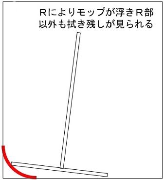 R巾木を施工した床に関しては(下図C)の通り平面モップに対してRが付いていることで浮きが生じ、清掃漏れが生じてしまいす。よってR巾木が施工されている箇所に関しては拭き残し(写真D)が多くみられるのが実態です。