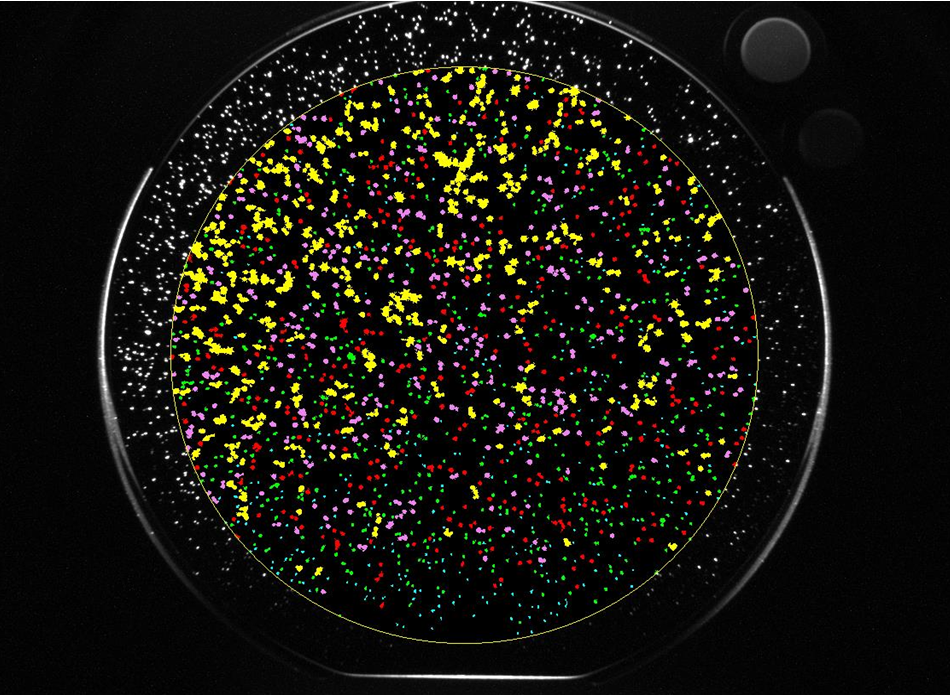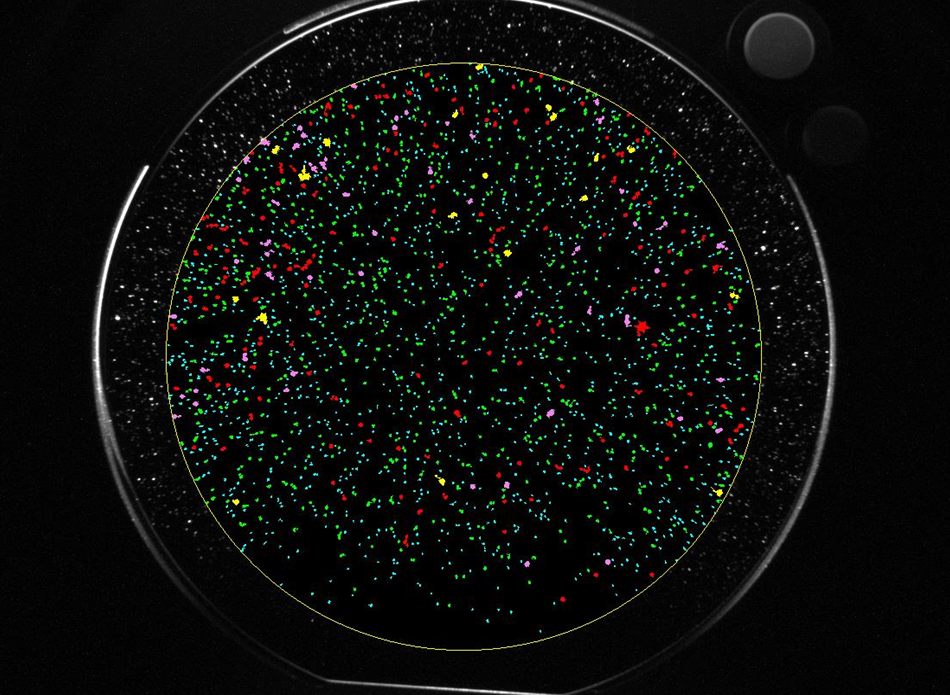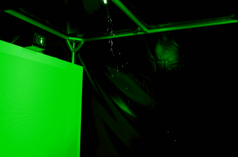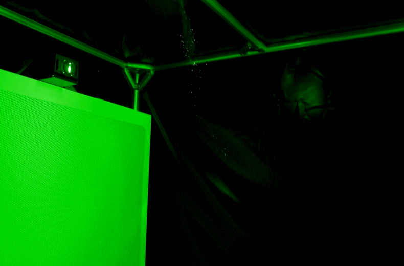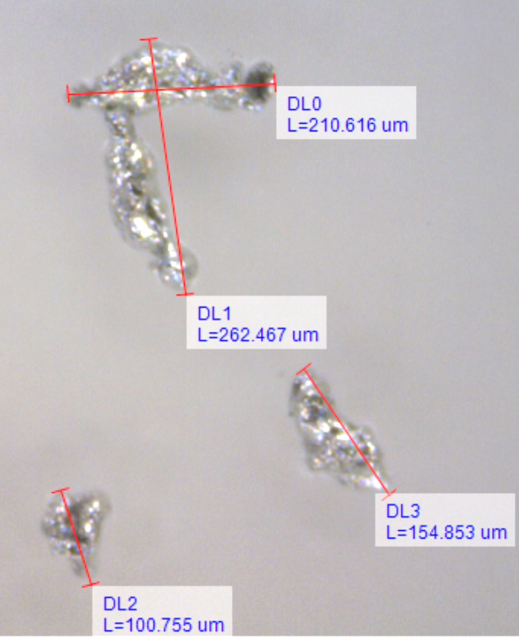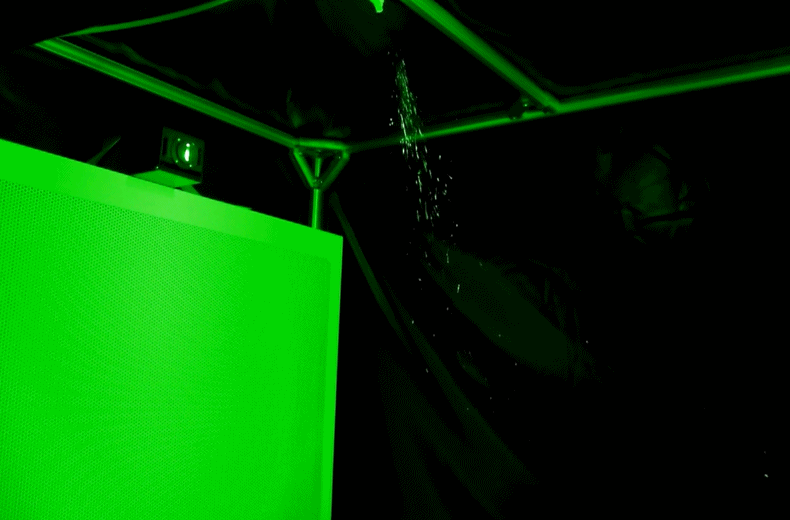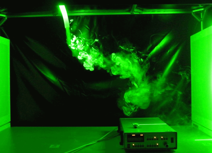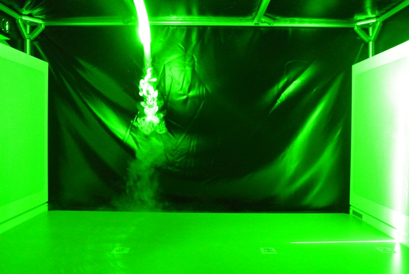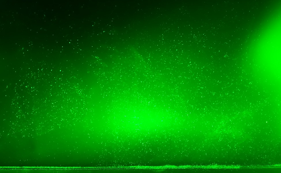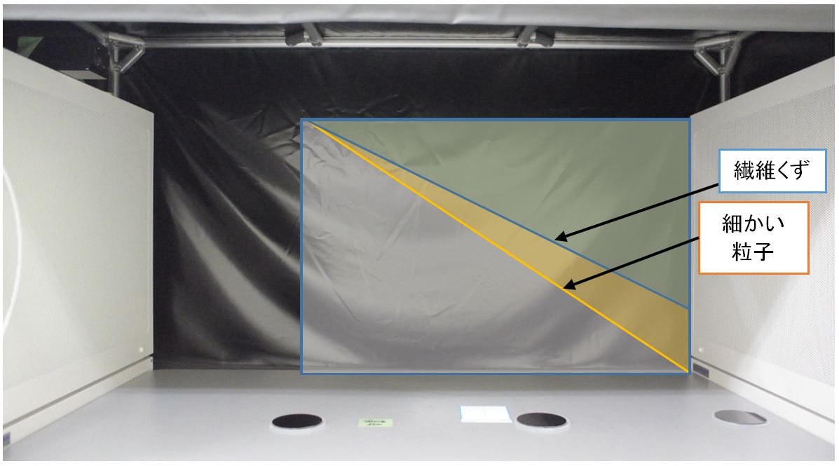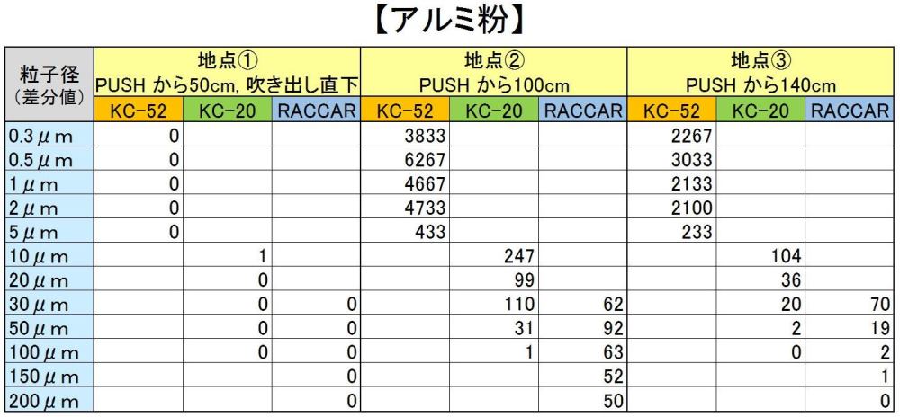| 今回の実証実験は上記を確かめるためのものです。使用するのは給排気を備えたクリーンウォール付のクリーンベンチ。見えやすいように黒カーテンで囲ってあります。テーブルの上にはパーティクルカウンター、粗大粒子用パーティクルカウンター、RACCARがありサンプル集取します。試料にはダイヤモンドヤスリで削ったアルミ粉、銅粉、コットンリンター(綿花の短い方の繊維)、ミストストリームによる霧の4種を使用します。撮影は暗室状態でレーザーシート光を使用しています。 ※ 微粒子パーティクルカウンター/型式:KC-52・・・0.01CF吸引×100 粗大粒子用パーティクルカウンター/型式:KC-20・・・1CF吸引x1 粗大粒子カウンター「RACCAR」/型式:CS-RA001・・・5分間測定/5 ※ どれも1分分の塵埃量に揃えています。