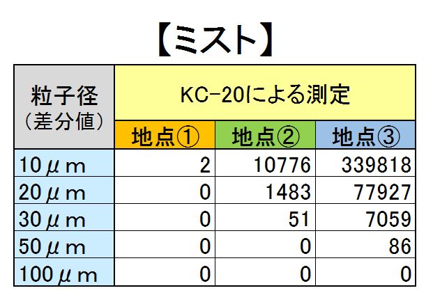 ミストストリームの霧はこの中で唯一球状をしています。表面張力が高い液体だからです。しかも球は重力の影響を受けやすく形状による浮力を生じません。 従ってよく落ちます。また、RACCARでの採取は蒸発してしまうので不可です。