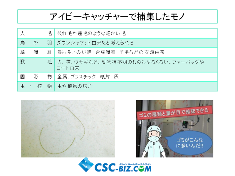 基本的には製造されている製品によって異物も様々です。基本的には人の服由来の繊維くずがやはり圧倒的に多いです。製造装置にはカバーが掛けてあったり、陽圧化されていますが軽量でカバー扉を開けた瞬間などに装置内に入り込み内部に留まります。