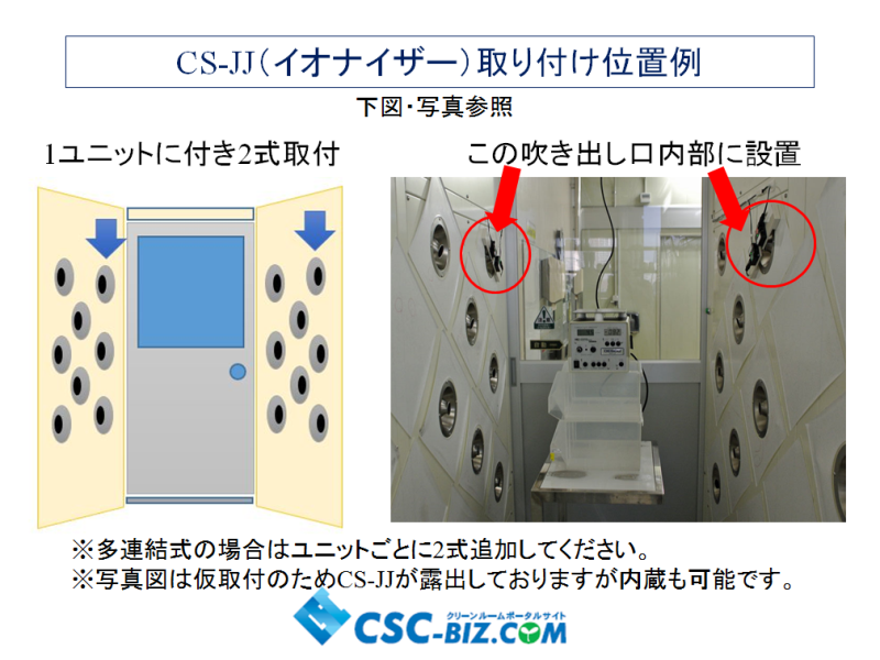 DCタイプのイオナイザーで他社メーカーエアシャワーにも後付け可能です。(メーカー名や写真を事前に添付してください)イオナイザーの問題点は動作時間に対してメンテナンス頻度が高いこと。その点、エアシャワーの動作に合わせてイオナイザーを動作させるのでメンテナンス頻度をぐんと落とすことが可能になりました。