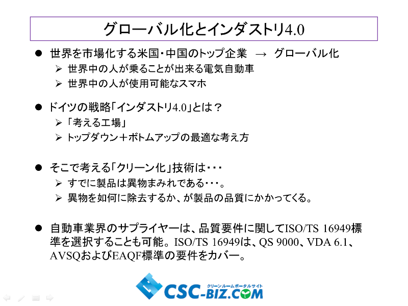 | 【1】 VDAとは?(インダストリ4.0とVDA) VDAとクリーンルーム規格(ISO14644シリーズ)はどこが違う? VDAで初めに決める4つの要素 @清浄度仕様書の作成 初期状態の把握を行う(構成部品・集合体・組立システムについて) ※特にキラー異物とは?/飛散・拡散状況/なぜなぜ分析) A作業員教育 (マネジメント/作業員入室/発生させる工程管理/除去/業者) B工程中の発塵と仕舞 (プロセスから・・・作業環境/発塵工程があるか?/対策の作成) C物流時のクリーン化 (内外部の物流、保管/サプライチェーンの確認) その1のまとめ 【2】 VDAで決める4つのクリーンエリア CG1 一般エリアで出来るクリーン化 CG2 発塵工程の仕舞 CG3 VDA独自によるクリーン化 CG4 クリーンルームによるクリーン化 終わりに ※今回は【1】についてのみのプレゼンになります。 「VDAによるクリーン化超入門編」レジュメお申し込みの方は・・・ 1会社名 2部署名 3ご氏名 4お電話番号 5e-mail 6ご住所 7お申し込 み理由 8パワポ/PDFを希望 をご記入の上ご連絡ください。 担当:大杉 https://www.csc-biz.com/contact/ 電話:078−252−7201/FAX:078−252−7210 |