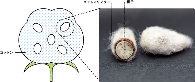 まずは、天然繊維くずの代表的な綿花(コットンリンタ―)です。綿花は種子を包んでいる繊維で、種の保存のために風に乗せて遠くまで飛びやすいようにできてきます。太さは20μm程度で、形状は不均一のスパイラルです。曲がりくねった繊維となるのは、ネジレと不均一な太さが起因と考えられます。FT−IR分析では、セルロースが検出されます。 |