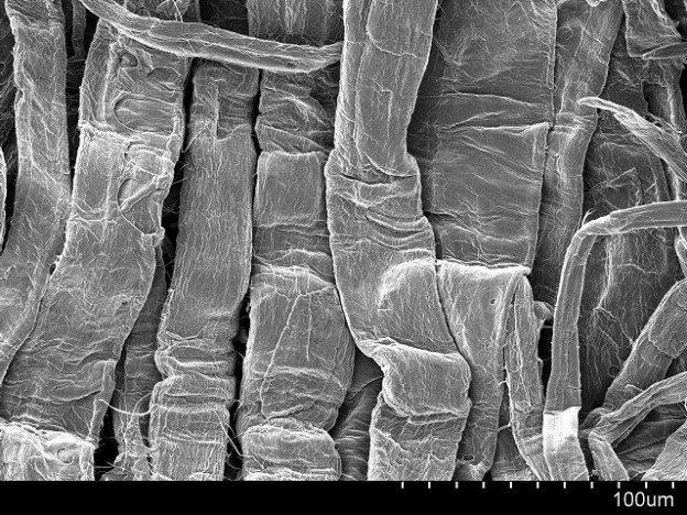 次は、ティッシュペーパーです。繊維自体が押し潰されています。押し潰された植物繊維は加工繊維として考えられます(コピー用紙など)。SEM観察おける発生源の特定には、この潰れも重要な情報です。FT−IR分析では、セルロースが検出されます。 ティッシュペーパーは短い繊維が押し固められた状態で繊維の脱落が激しいため、クリーンルーム内で使用することは避けましょう。 |