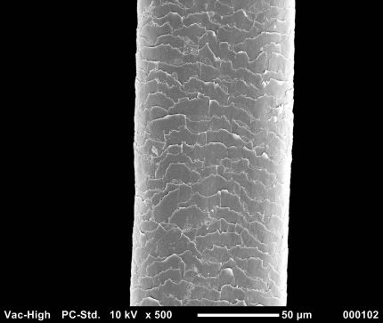 鱗形状の繊維クズの大半は髪の毛、或いは動物の毛です。FT−IR分析では、クモの糸と同じく蛋白質が検出されます。 人の毛髪対策では、毛髪を通さないフードやクリーンウエアが大事な役割を担っています。 |