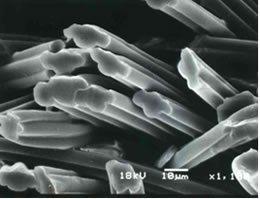| 繊維くずは大きく分けて天然繊維と人造繊維の2種類に分類されます。 ◆天然繊維(植物繊維、動物繊維、鉱物繊維) ◆人造繊維(再生繊維:レーヨン等、半合成繊維:アセテート等、合成繊維:ナイロン,ポリエステル,アクリル,ビニロン等、人造無機繊維:ガラス繊維,炭素繊維等) 発生源の特定を行うには電子顕微鏡(SEM)を用いて形状を観察し、更に成分分析を実施する必要があります。SEMによる表面観察において特徴的な形状のものもあるので、見慣れてくれば、これら2分類に分けることも可能です。ここで一部紹介します。 |