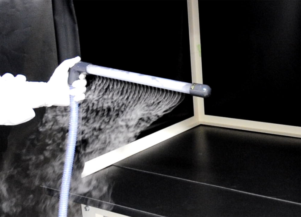 気流を可視化する装置です。陽圧/陰圧の確認や気流の確認に有効です。 特に製品に向かう気流の上流に発塵する人や装置がないかの確認が不可欠です。当初のフロアーレイアウトでは様々な状況を加味して行いますが、物が増えたり移動するのに伴い気流が乱れるのが実情です。 |