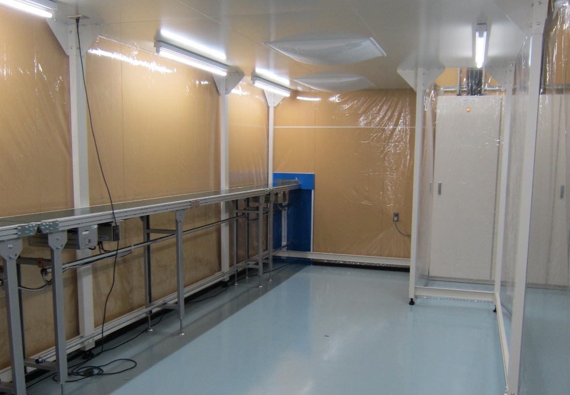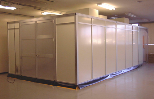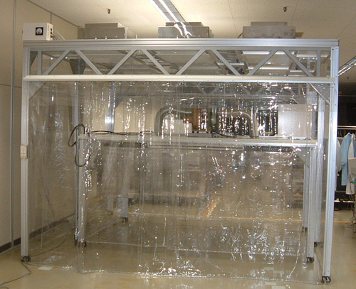 アルミ製のクリーンブースは、アルミ枠の周囲をビニールカーテンで覆います。FFU稼働時には内部が陽圧になり、カーテンが膨らみますが床上10cmほど空いているため、周囲へ均等に空気を逃がすことで清浄度が出やすい構造となっています。設置する際は、若干ですが圧力による膨らみを考慮する必要があります。アルミ製クリーンブースの難点としては、アルミに溝があるため掃除がしにくいことです。