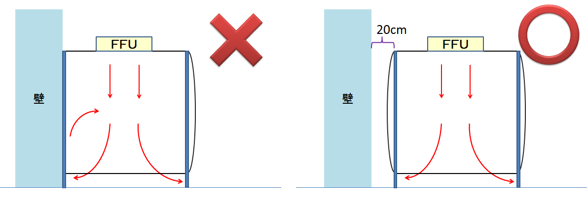 アルミ製と鋼板製は、周囲をビニールカーテンで囲み下部を開けることで空気が逃げやすく、清浄度が維持されます。(下部に障害物がないことが前提です)ただし、カーテンの膨らみを想定した上で、空気が逃げられるよう壁から最低20cm離すことをオススメします。空気が壁にあたるとブース内に停滞し、清浄度に大きな影響を与えるためです。