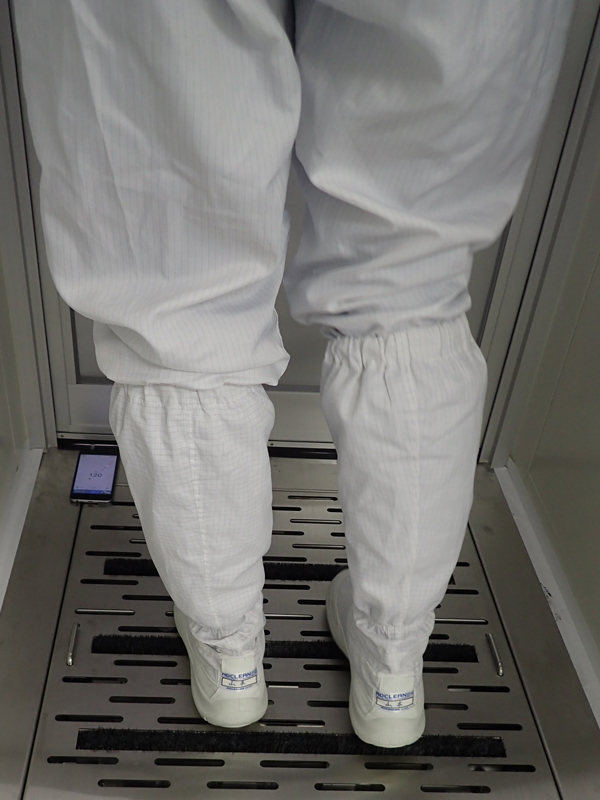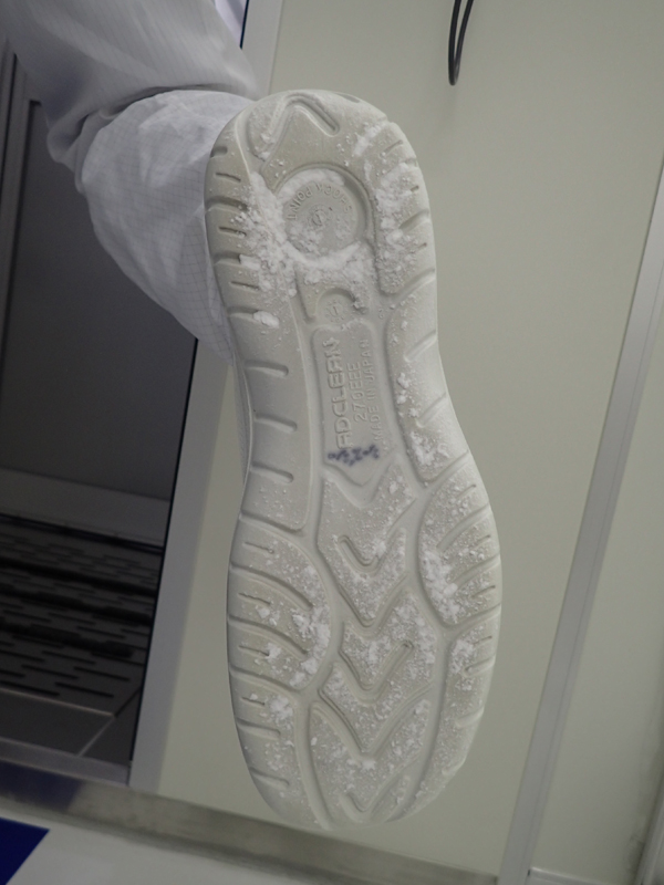 エアシャワーでウエアから塵埃を落とすことは可能ですが、パンカーの角度から靴底に付いた塵埃を落とすことは難しく、持ち込み塵埃の原因の1つに挙げられます。
