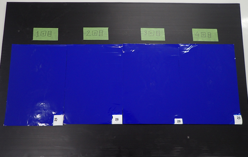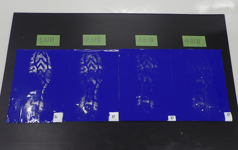 エアシャワー後、まず一歩目を粘着マットの「1回目」と記した位置に足を置くと大量のコットンリンターが残り、足跡がくっきり残りました。その後、2回目、3回目、4回目と踏んでいくと、足跡が薄くなっていきます。