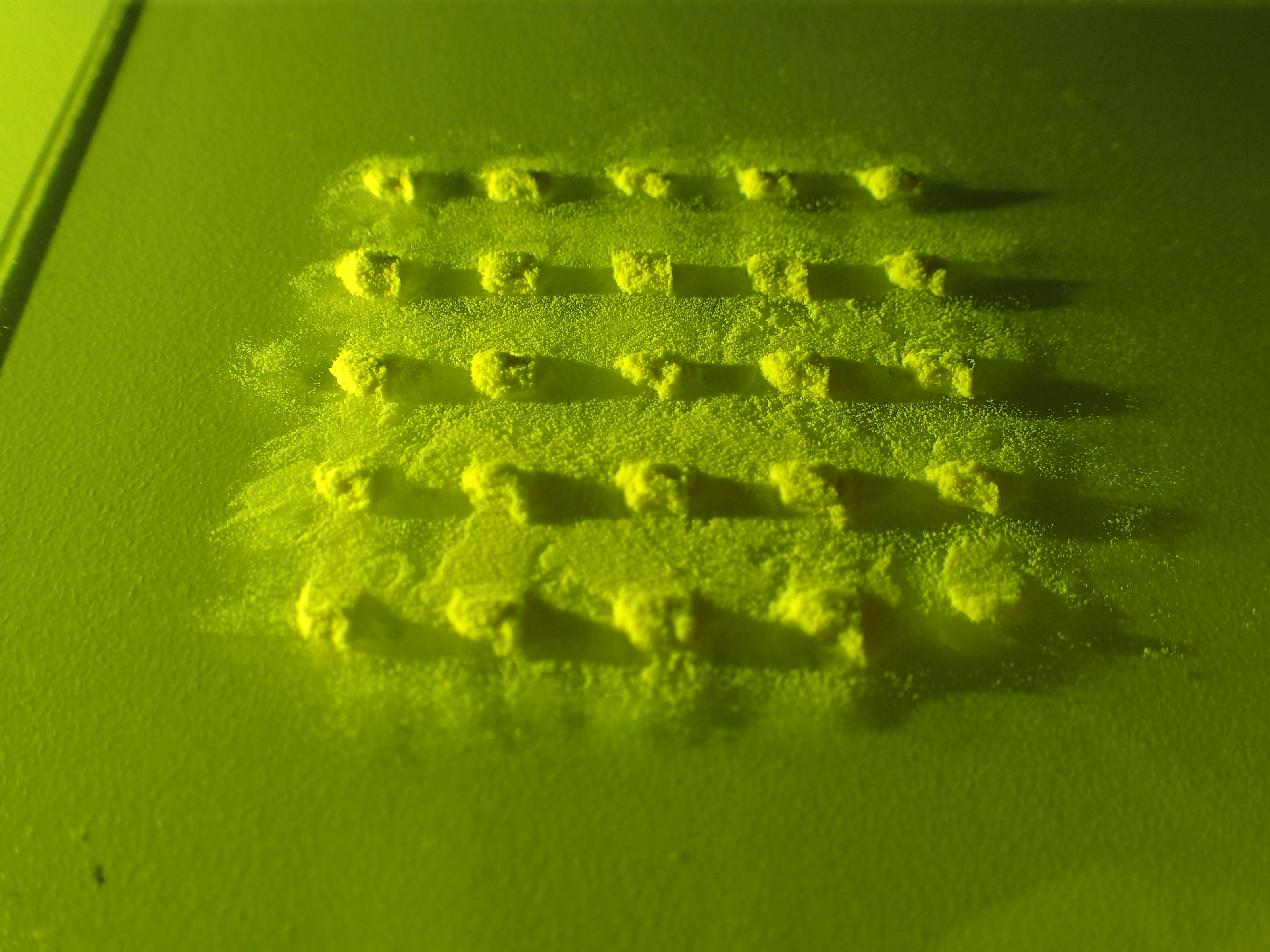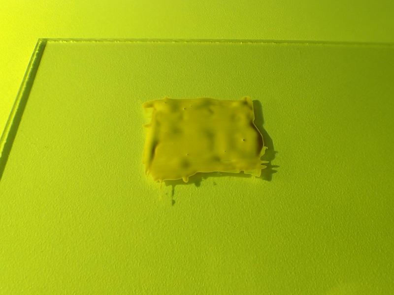 1)透明塩ビ板と汚れに見立てた5種類の代用品(白色ワセリン/石松子/醤油/リキッドファンデー