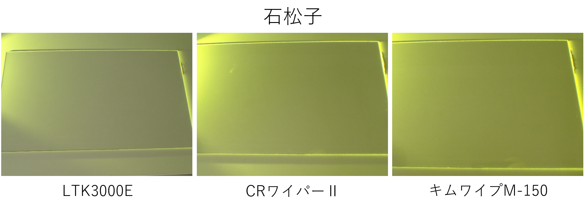 に関しては切断試験による発塵テストの数字にも表れているようにクリーンルーム用ワイパーとしては安全性が一番高い評価になります。拭き取り力から見ると、液体の拭き取りにはあまり適しませんが超極細繊維を使用しているため、繊維くず等の乾燥した異物の除去には最も適したワイパーとの結果となりました。LTK3000Eは回数制限はありますが、クリーンクリーニングによる再生が可能です。