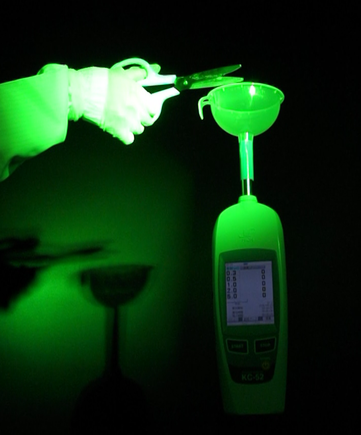 2)ワイパーを張った漏斗をパーティクルカウンタ(型式:KC−52の上にセットし、裁断ばさみで決まった長さ(3cmほど)にカットした時の発塵量を測定する。