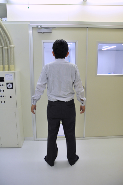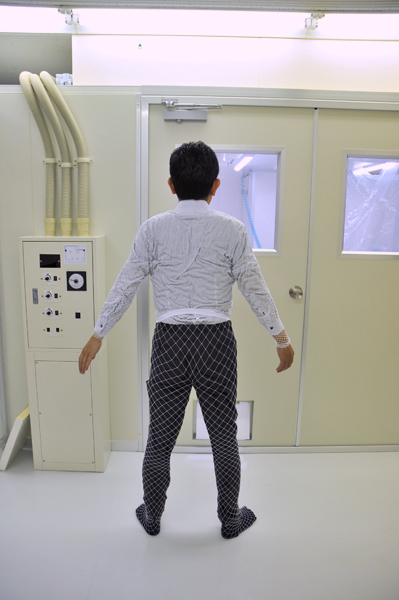 | 【実験目的】 実験者が、【クリーンウエアの下に服と肌の間に空気が入るほど大きいサイズの服を着用した場合】と、【意識的に服と肌が密着するよう押さえつけた密着性の高い場合】とで同じ動作を行った場合の発塵量を比較検証し、インナーウエアの状態によってどの程度、発塵量が違うのかを検証する。 |