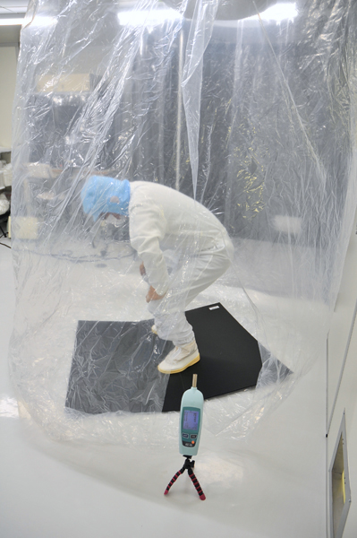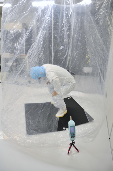 | 【実験方法】 1) 実験者が、Tシャツとワイシャツの上に網タイツを全身装着した状態で、クリーンウエアを着用する。 ※クリーンフード、クリーンシューズも着用 2)FFU搭載の天井に人が入れるほどのビニール袋でFFUを囲い人が中に入れる空間を確保し、下部にパーティクルカウンタを設置する。 3) 2)のビニール袋の中に入り、FFU直下で屈伸動作(40回/min)を行い、パーティクルカウンターで3分間測定する。 4)網タイツを外した状態で3)を実施する。 |