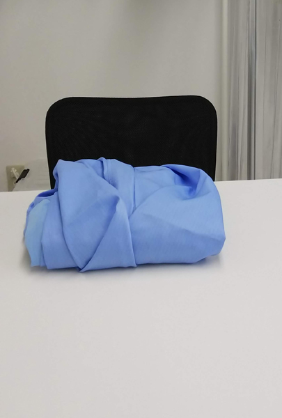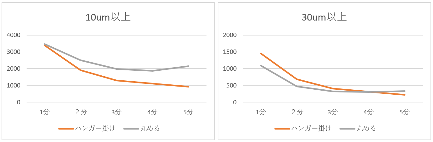 | 【実験方法】 1)クリーンウエアにパーティクルを付着させるために、クリーンルーム内に8時間程度曝露する。 2)クリーンルームにてある程度汚染されたウエアを、吊るした状態と丸めた状態の2パターンを一般環境にて4日間放置する。 3)放置したのち、2パターンともにタンブリング試験装置にてパーティクル量を測定し比較を行う。 |