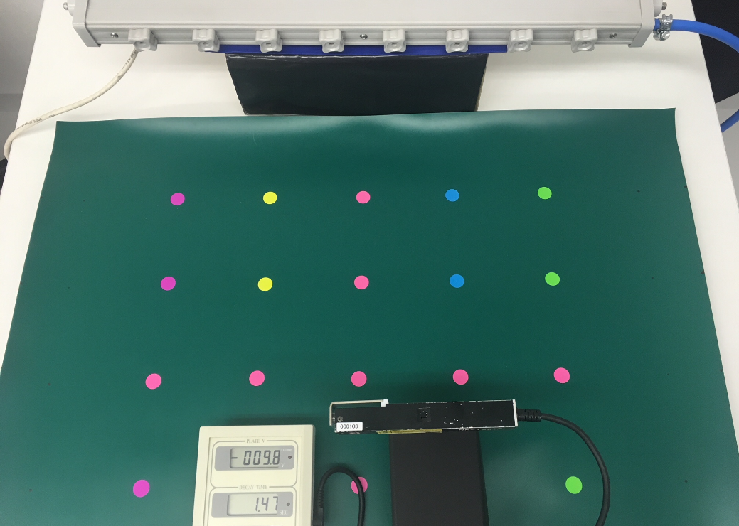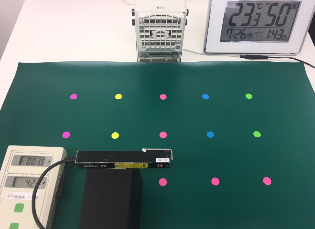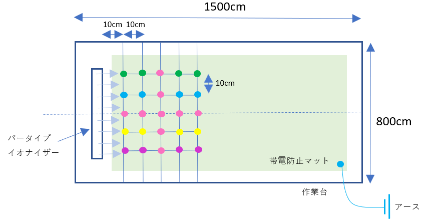 2) ファンタイプは風速MAXとボリューム「6」、バータイプは圧縮エアー有・無にて設置方向から直進方向へ10〜50cm(10cm毎)、左右方向へも同間隔で風速と除電時間(1000X→100X)の測定を実施します。