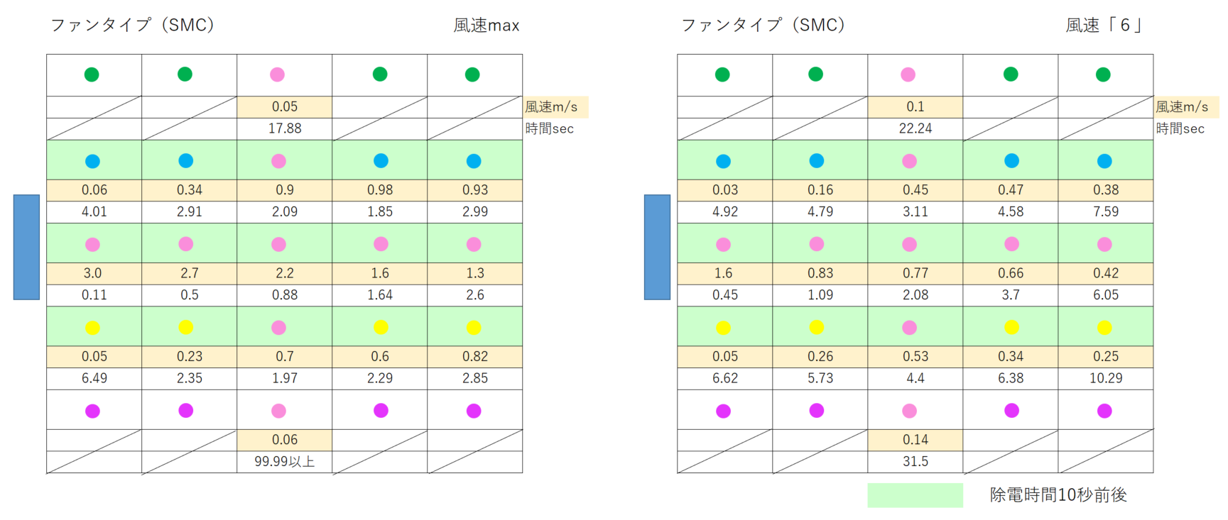 ファンの風量が弱くなればイオンを遠くまで飛ばす能力も低下し、時間の経過と共にイオンも消える為、除電時間は長くなっていると考えられますが、30×50(cm)での小型ワークの除電作業では十分効果が得られることが判りました。