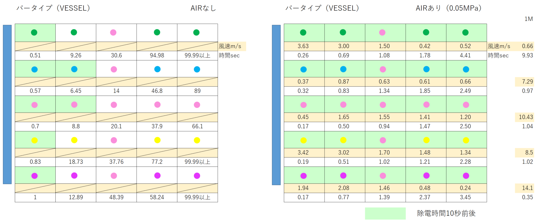 圧縮エアーを供給した場合は、幅50cm×直進方向50cmの全測定ポイントで5秒以内の除電効果が得られたので、特に短時間で除電したい場合に効果的です。 直進方向1000cmで測定した場合も、10秒前後で効果が得られましたので、大型ワークや広範囲の作業空間の除電にも最適です。