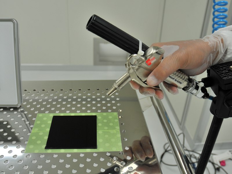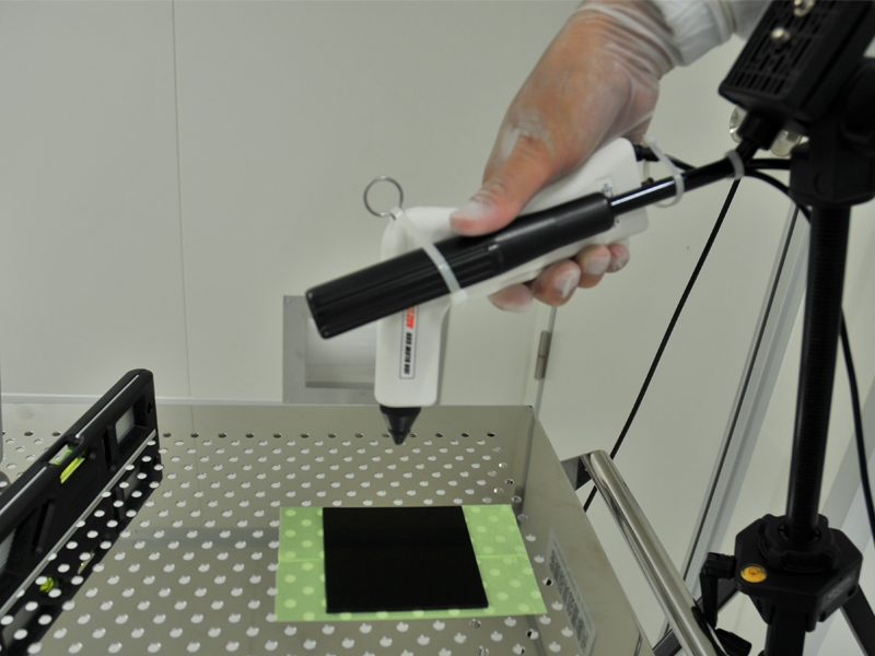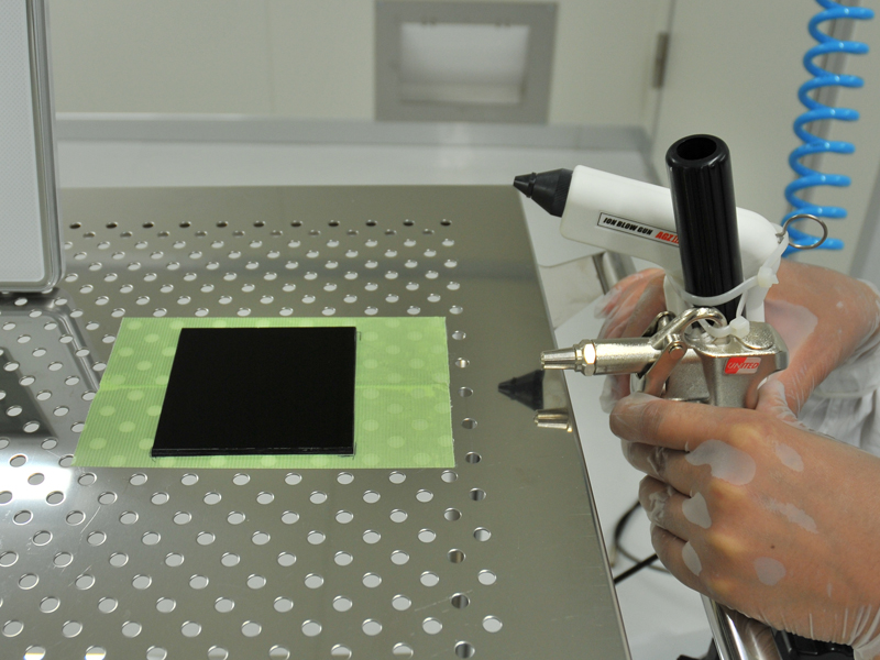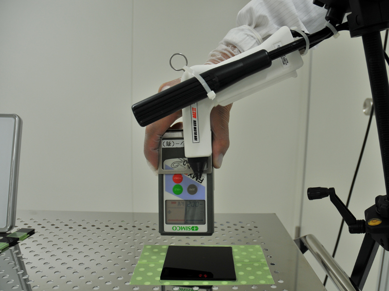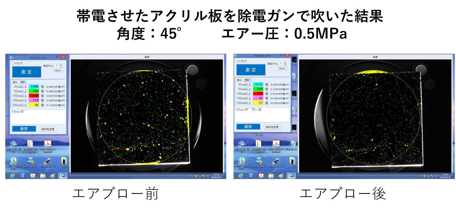 【実験結果】エアガンの吹き付け角度については、0°/45°/90°と比較検証を行った結課、資料の通り一般エアガンでは除去率が角度を増すごとに上がる傾向となりました。一般的には角度が無いほうが横からエアーすることで剥がすイメージで効果があると思われがちですが、角度があるほうが高い除塵率となりました。除電エアガンでは、角度や帯電物・非帯電物に左右されることがなく満遍なく高い除去率を得ることができることが確認されました。非帯電アクリルも帯電アクリル同様に高い除去率を得ていることから除電によりアクリルから剥離され飛ばされるとの結論には至りませんが、除塵には除電機能付きのエアガンが有効であることが確認できました。 |