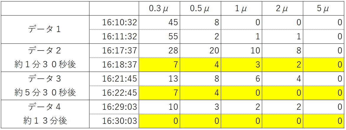 【考察】煙草はガス成分と粒子成分に分かれますが、いずれも大きさは0.3μから1μほどの大きさになります。簡易的な実験結果になりますが、クリーンルームで生産する製品への影響を考えますと、ガス成分がNGのクリーンルームに関しては喫煙後5分以上の待機は有効になります。半面1μ以上が粒子が製品にとってNGの場合は更衣している間の呼吸により浄化されるほどの対応で十分になります。最後に煙草はクリールームへの影響の前に、喫煙者本人に与える身体への影響を考えると、望ましくは禁煙をお勧めいたします。今後も【クリーンルームあるある】と称して、様々な検証実験を実施していきたいと思います。 |