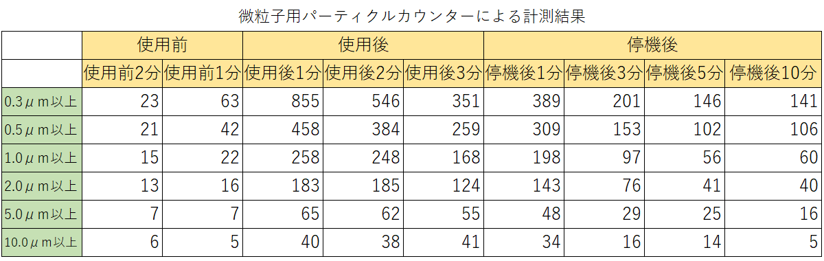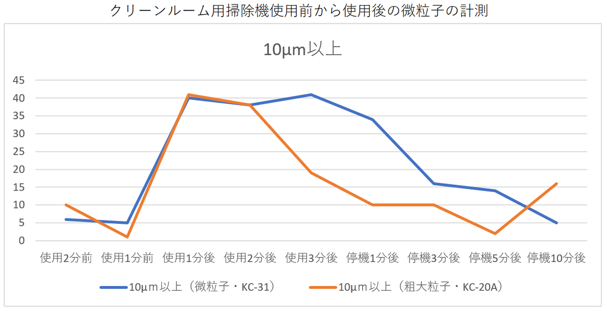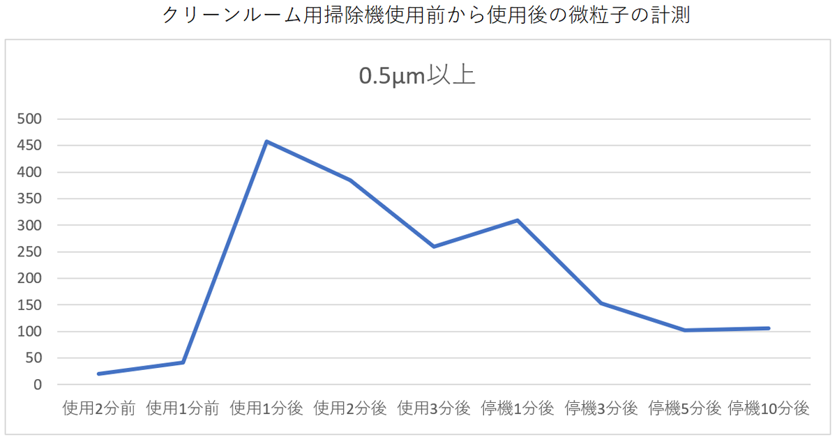結果は下記表の通り。掃除機使用前はISO5(クラス100)で安定していた清浄度が掃除機を使用後すぐに悪くなります。掃除機後の清浄度変化は、徐々に良くなっているものの10分を経過した時点で、10μm以上の粗大粒子は概ね掃除機使用前に戻りましたが、微粒子は戻りませんでした。