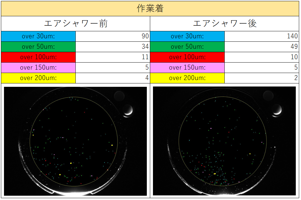 | 「一般服VSクリーンウエア エアシャワーでの効果の違いは!?」 今回のクリーンルームあるあるですが、よく見かける前室の風景として上着を脱いでエアシャワーを浴び、更にクリーン服を着用してエアシャワーを浴びるという、一連の動作に関して検証してみました。 【実験目的】一般服(綿70%、ナイロン30%)、クリーンウエア(すう〜っとクリーン)を着用してエアシャワーを浴びた場合の効果を検証【実験方法】1) 一般着(今回は綿生地の作業着)の表面にウエハを3回軽くたたくようにして塵埃を転写させて「粗大粒子カウンターRACCAR(ラッカー)」にて計測2) 同一般着にてエアシャワーを浴びる(片吹エアシャワー) 3) エアシャワー後に再度ウエハに塵埃を転写させて計測 4)1〜3の動作をクリーン服も同様に実施。 ※クリーン服は一般環境で12時間ほど着用して塵埃を意図的に付着させています。 ※弊社お客様との共同試験の為に写真等は掲示できません。 |
