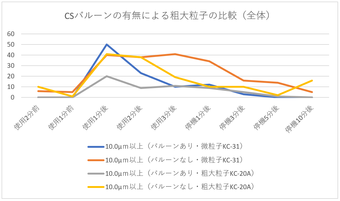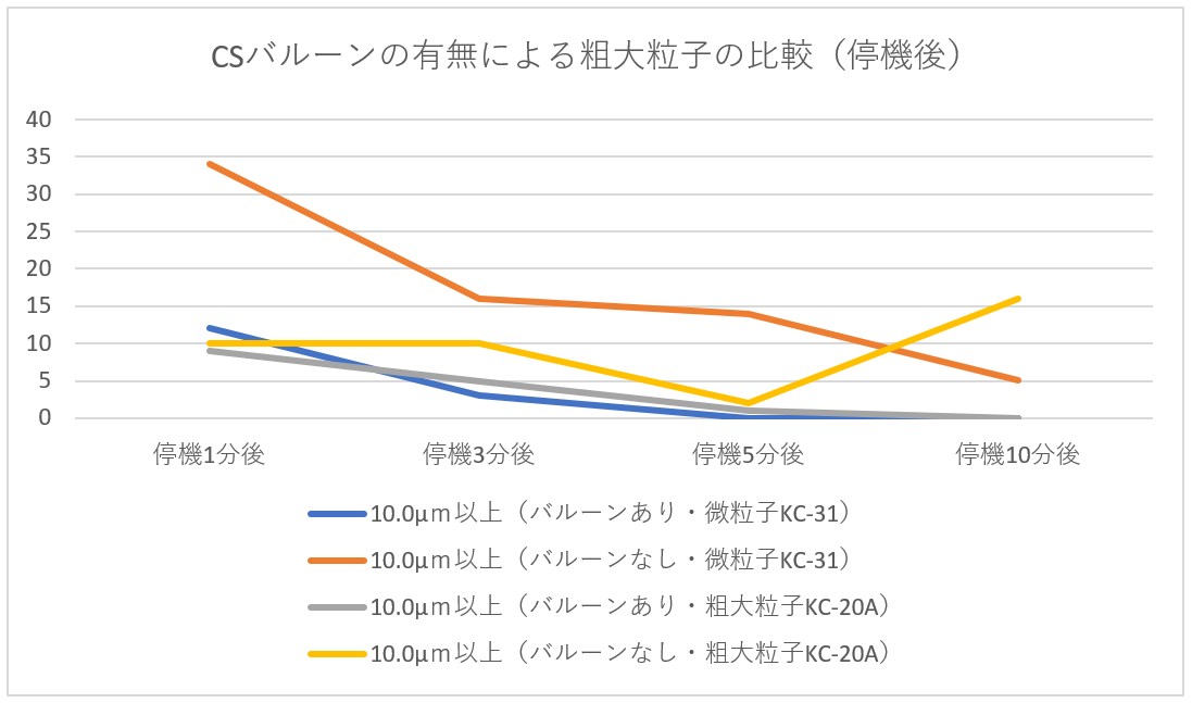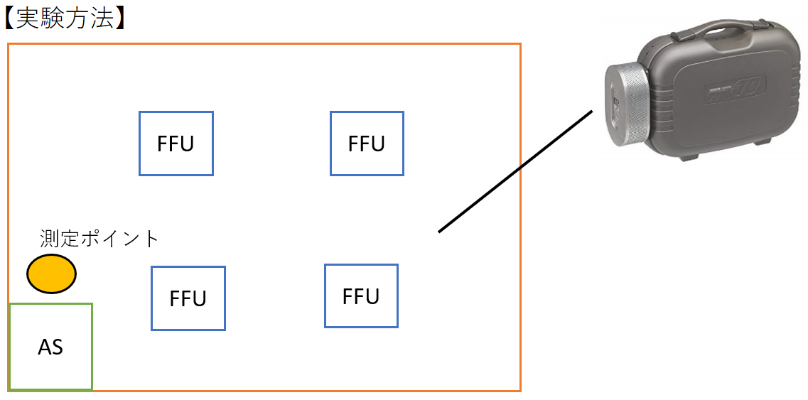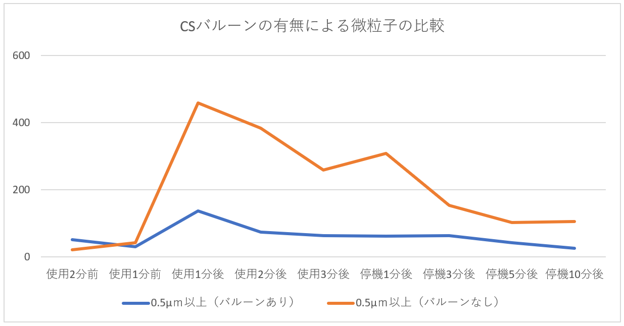 | 「クリーンルーム用掃除機使用における清浄度変化について(バルーンあり)」実験レポート クリーンルームあるある実験レポート第2弾 で掃除機を使用する前後での清浄度変化についてレポートしましたが、今回は吹出口にCSバルーンを取り付けて疑似層流を作り出し前回と同条件にて検証を行いました。 【実験目的】(疑似)層流式クリーンルームにてクリーンルーム用掃除機を使用して掃除行った際の清浄度変化について調査する。【実験環境】クリーンルームサイズ: 床面積28u 高さ2.1m温度 24。2℃ 湿度 54.0% 総風量 約28m3/min(吹き出し面からの風速は約0.2m/secにて) ※吹き出し口にCSバルーンを取り付けた状態