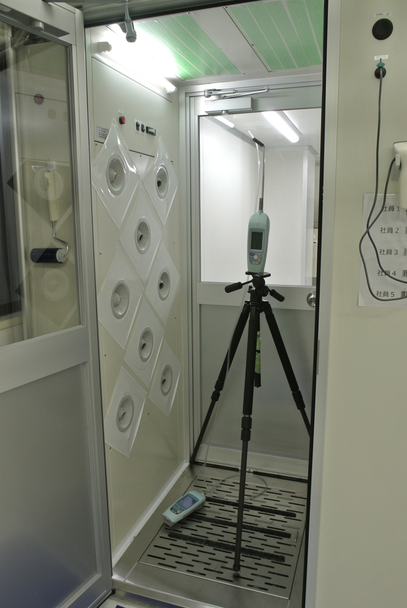 エアシャワー庫内の粒子の舞い上がりをより効果的に抑える方法を探るための実験です。