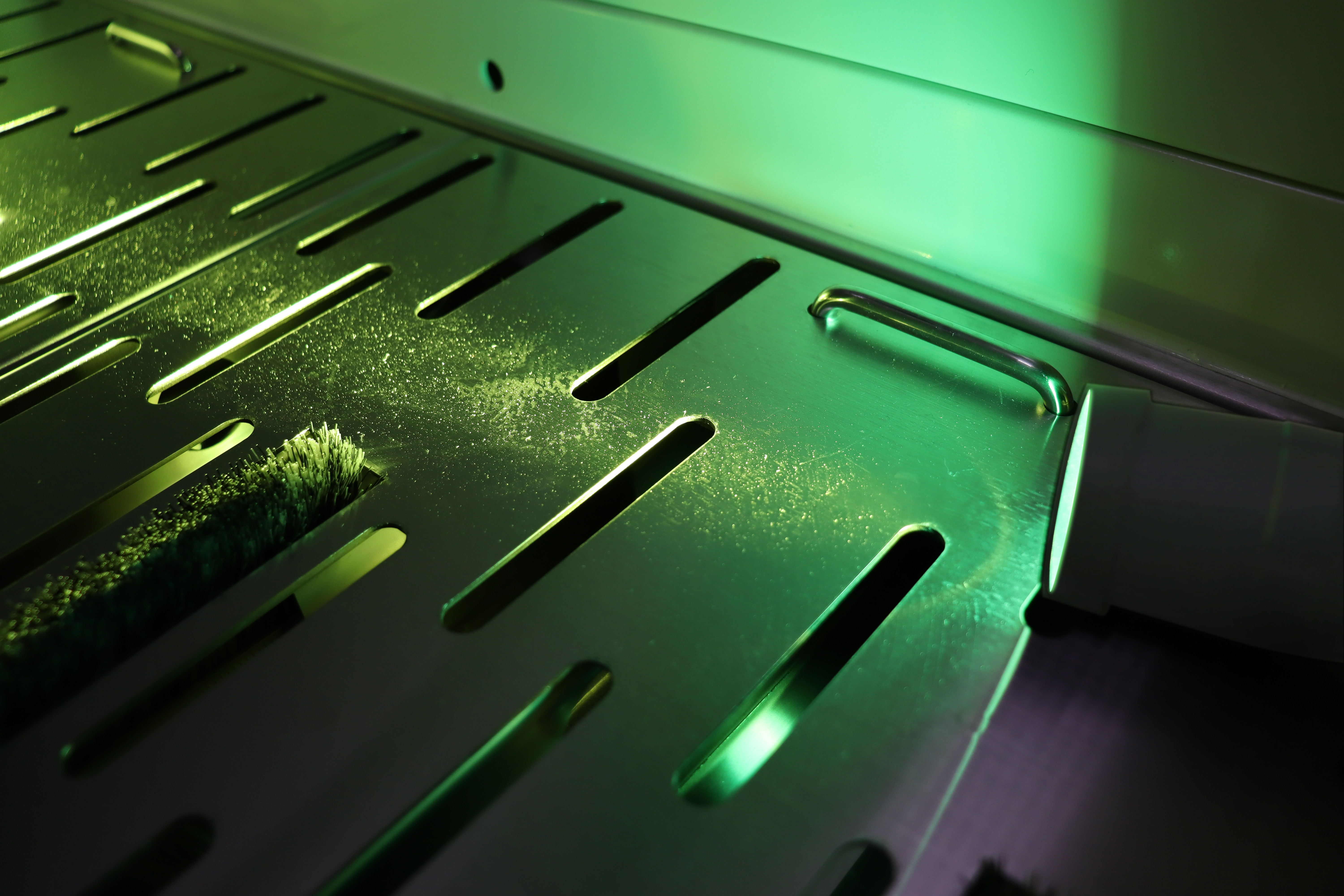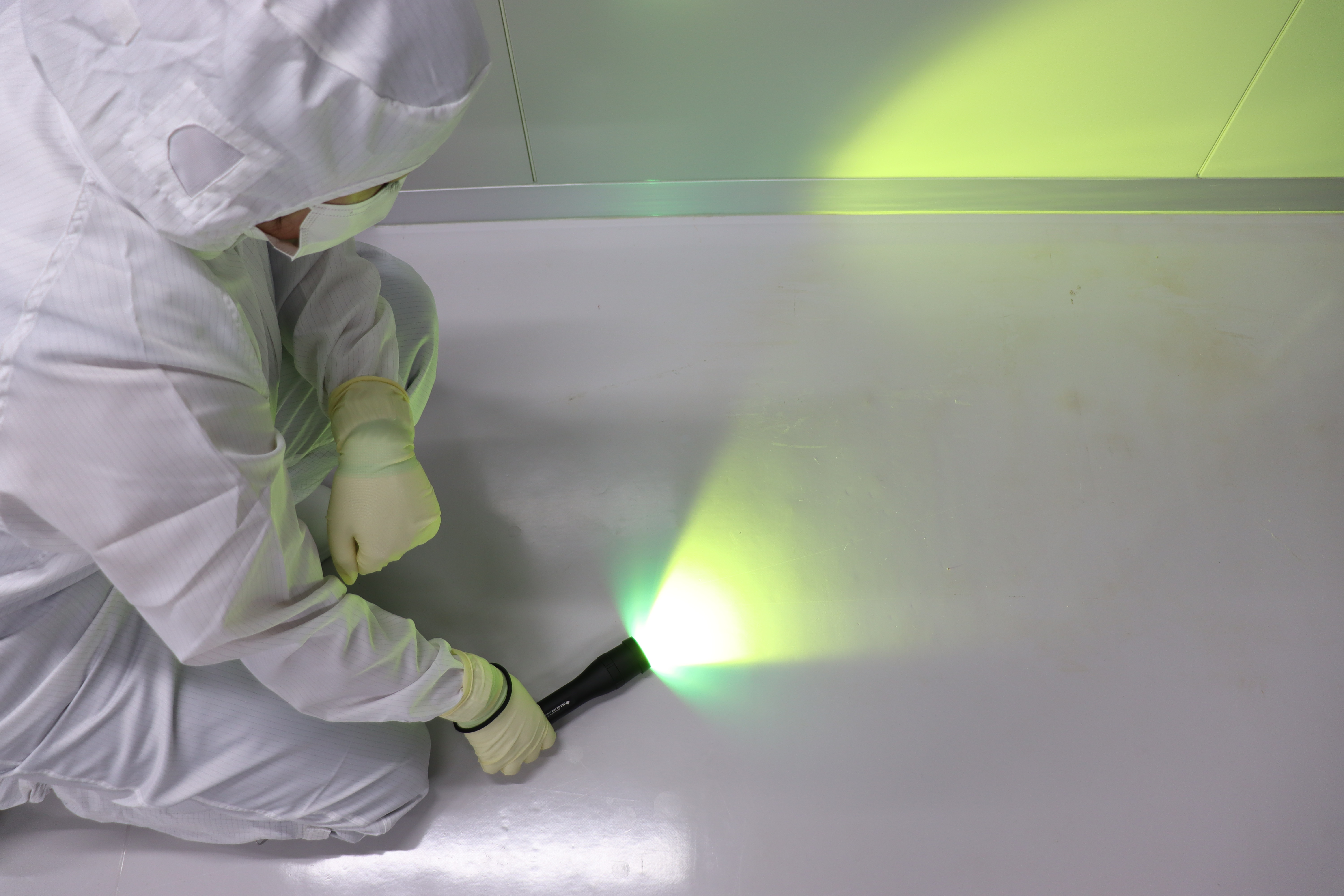 When checking the inside of an air shower with a Cleanroom Light Mini A, the worker found sedimentary debris.