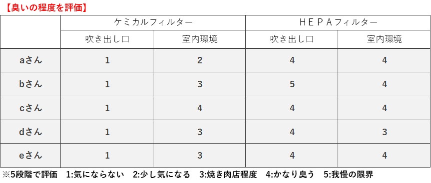 直火の焼肉と比較するとどれも味が劣る気がします。 今回はこの悩みがケミカルフィルターで解消できないか?やや趣味もかねての検証を実施しました。一人で焼肉屋さんに行くのは恥ずかしいところですが、仮にうまくいけばテレビを見ながらエアコンの効いた部屋でビールを飲みつつ1人焼肉! なんて贅沢が叶うかもしれません。一般的に塵埃(微粒子)を除去するにはプレフィルターや中性能フィルター・HEPAフィルターなどがありますが、 臭気などの有機・無機化合物系はケミカルフィルターという活性 炭系のフィルターに吸着します。 今回はこのケミカルフィルターがどの程度能力を発揮するかの検証を実施しました。 【使用機器・備品】 ・実験用特注品 臭気吸着無臭化装置(ファンフィルターユニット NSF-03A搭載) ・ケミカルフィルター ・NSF-03A用 HEPAフィルター ・牛肉 400g ・カセットコンロ ・焼肉用鉄板 【実験方法】 1)カセットコンロの上に焼き肉用鉄板を置き、カルビ、ハラミ、ホルモン等400g程を焼く。 2)ケミカルフィルターを装着したファンフィルターユニットを稼働させ、吹出口からの臭いを嗅ぐ。(被験者5名、順番に) 3)一旦退出し、再び部屋に戻った際の部屋の臭いを嗅ぐ。 4)中性洗剤を使い、実験装置と周辺の油汚れをなるべく臭いが残らないようにキレイに拭取る。 5)フィルターをHEPAフィルターに交換し、1~3を繰り返す。 【実験結果】