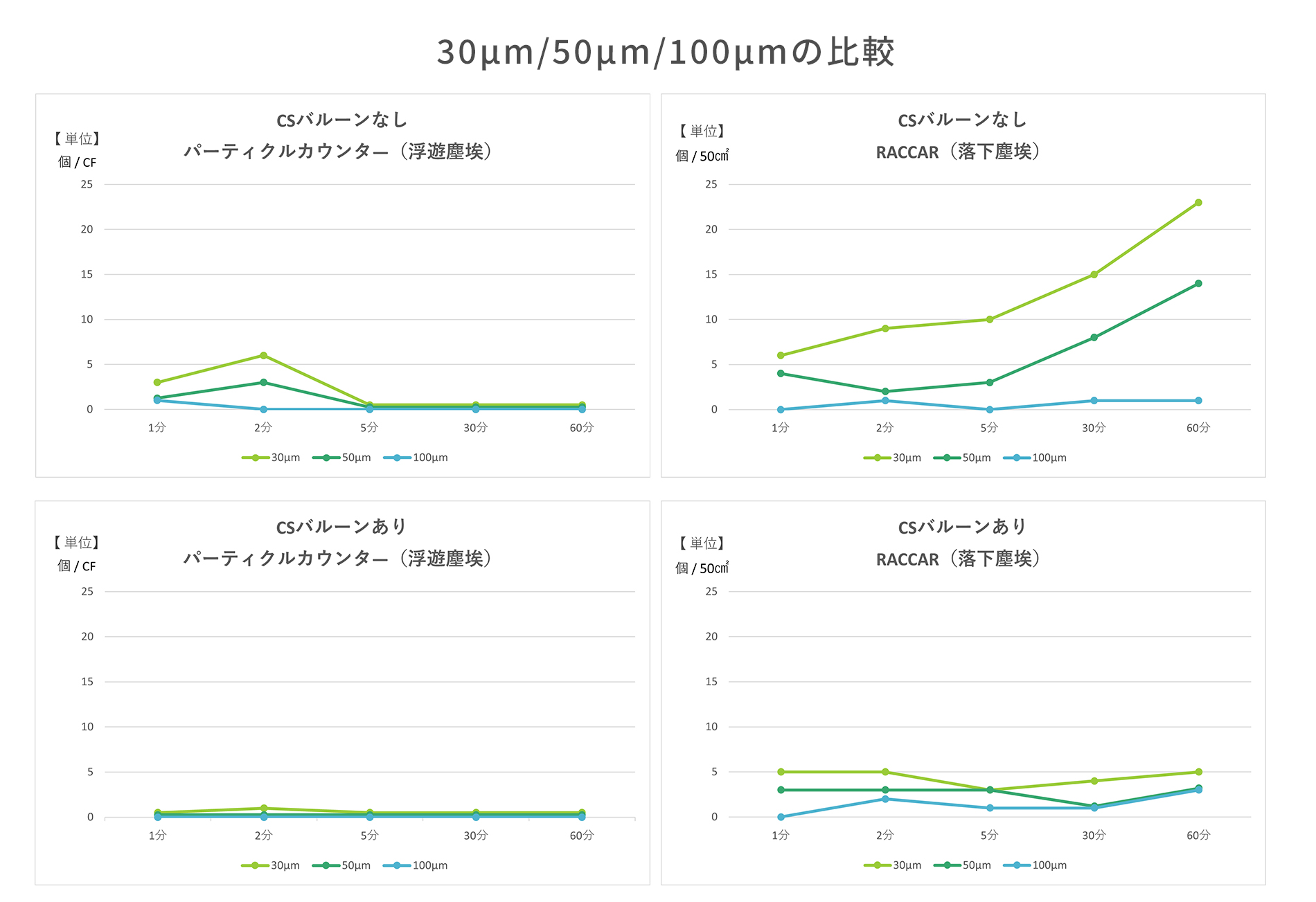 【考察】 CSバルーンなしの場合、タオルを振った直後から浮遊塵埃の量が増え、2分後にピークとなった後、その後はほとんど計測されなくなりました。落下塵埃の量は時間の経過とともに増える結果となりました。CSバルーンがないクリーンルーム室内では乱流が大きく、その影響により発塵発生直後は短時間のうちに発塵源周辺が汚染されその後室内に拡散します。またその後も塵埃が舞い上がりやすい状態のため室内に置いてある製品や装置などに時間の経過とともに堆積していきます。 CSバルーンありの場合もタオルを振った直後から浮遊塵埃の量が増え、2分後にピークとなった後、その後はほとんど計測されなくなりましたがCSバルーンなしと比較しますとその量は明らかに少なくなっていました。落下塵埃の量はタオルを振った直後と1時間経過後ではほとんど同じで時間の経過で大きく増加するということはありませんでした。CSバルーンをつけることにより層流性が高まり、クリーンルーム室内の乱流が抑制された結果、発塵発生直後でも発塵源周辺の汚染が軽減されていました。また舞い上がりにくい状態のため時間の経過とともに堆積塵埃が増えることもほとんどない状況でした。 今回の実験結果より発塵直後は浮遊塵埃が増え、その後は舞い上がりなどの影響により堆積塵埃が増えることが確認できました。またCSバルーンをつけることで浮遊・落下塵埃が抑制できることも合わせて確認できました。しかしCSバルーンをつけて抑制できたとしても発生した塵埃はクリーンルーム内からなくなるわけではなく、床などに堆積している状況であり、いつ再浮遊して製品などに付着するかわかりません。発生した塵埃は時に浮遊したり、時に落下して堆積したりします。塵埃の状況を正確に確認するにはそれぞれに適した測定器を使用する必要があります。浮遊塵埃を確認する場合は粗大粒子パーティクルカウンター、落下塵埃を確認する場合はRACCARが適しています。 そして何より大切なのは基本であるクリーンルームの四原則(①塵埃を発生させない、②塵埃を持ち込まない、③塵埃を堆積させない、④塵埃を速やかに除去する)を順守することです。工程を見渡していただき、正しく状況把握がされているか、クリーンルームの四原則が順守されているかどうかを再度ご確認いただければと思います。 【関連商品】 | |||