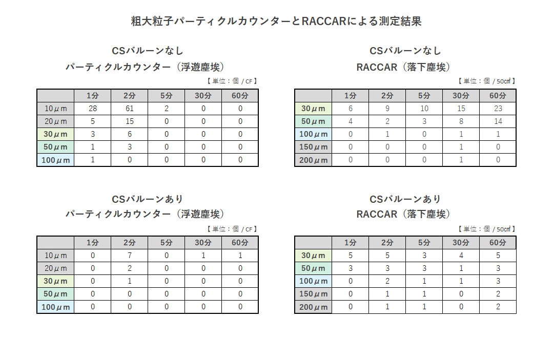 【使用機器・備品】 ・パーティクルカウンターKC-20A(粗大粒子用) ・RACCAR ・4インチシリコンウエハ ・CSバルーン | |||