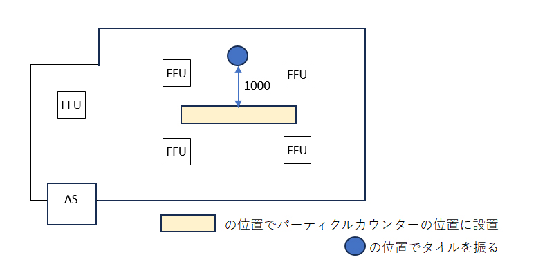 | ①クリーンルームの温湿度を23℃±3℃、湿度50%±5%に設定し、クリーンルーム中央の床面から高さ約1000mmの位置に粗大粒子パーティクルカウンターとシリコンウエハ5枚を設置する。 |
