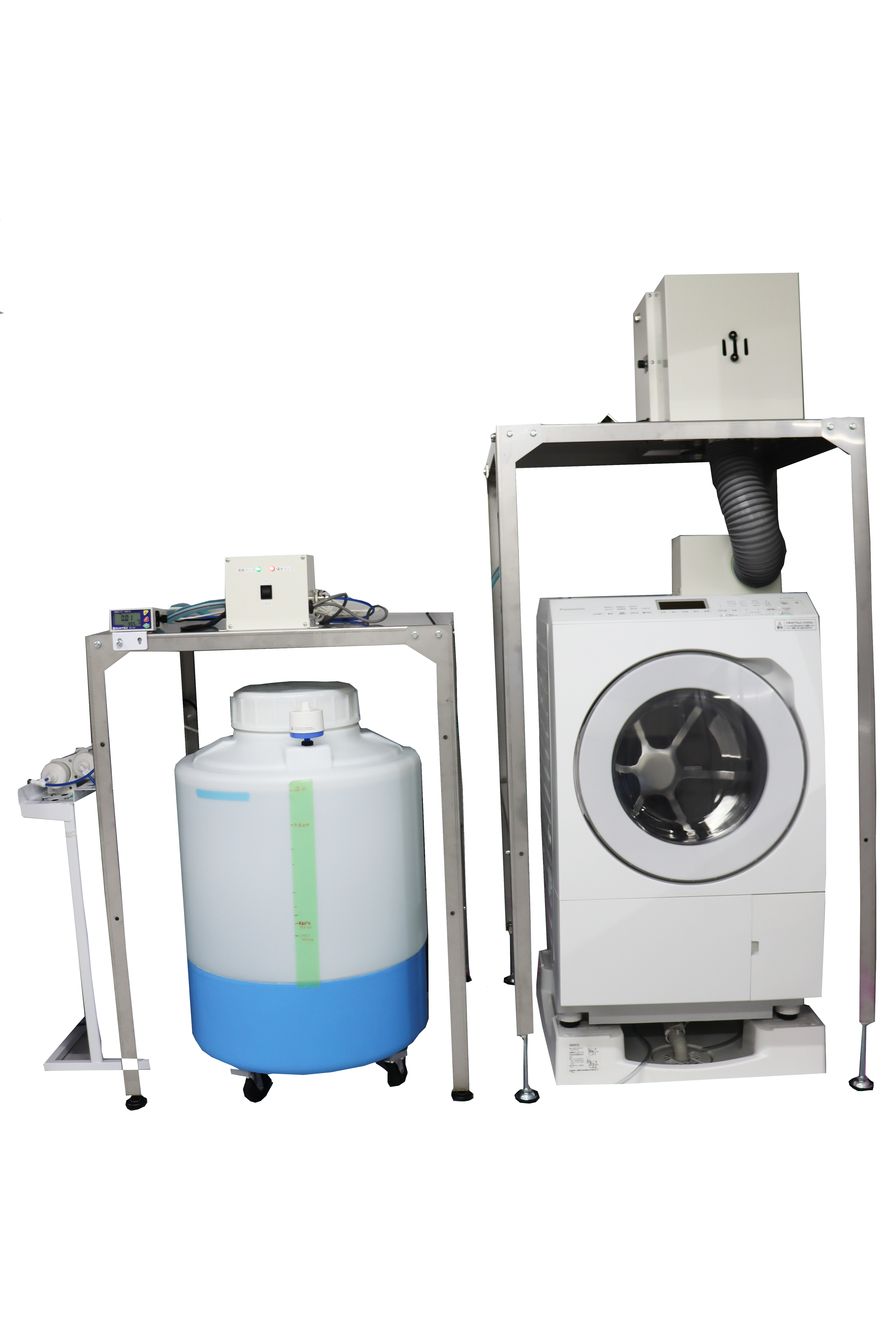 ・クリーン洗濯機 [市販洗濯機の使用条件] ①市水を繋ぎ、フィルターを通して濾過を行い純水にする ②純水でクリーンウエアを洗濯する ③HEPAフィルターを通した空気で乾燥エアーを循環させる |