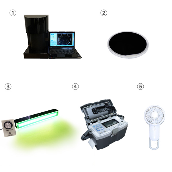 【使用機器】 ①RACCAR (粗大粒子カウンター) ②サンプル採取板 (4インチシリコンウエハ) ③ダストファインダーL3SQ (グリーンフィルター付) ④風速計(カノマックス製) ⑤ハンディファン |