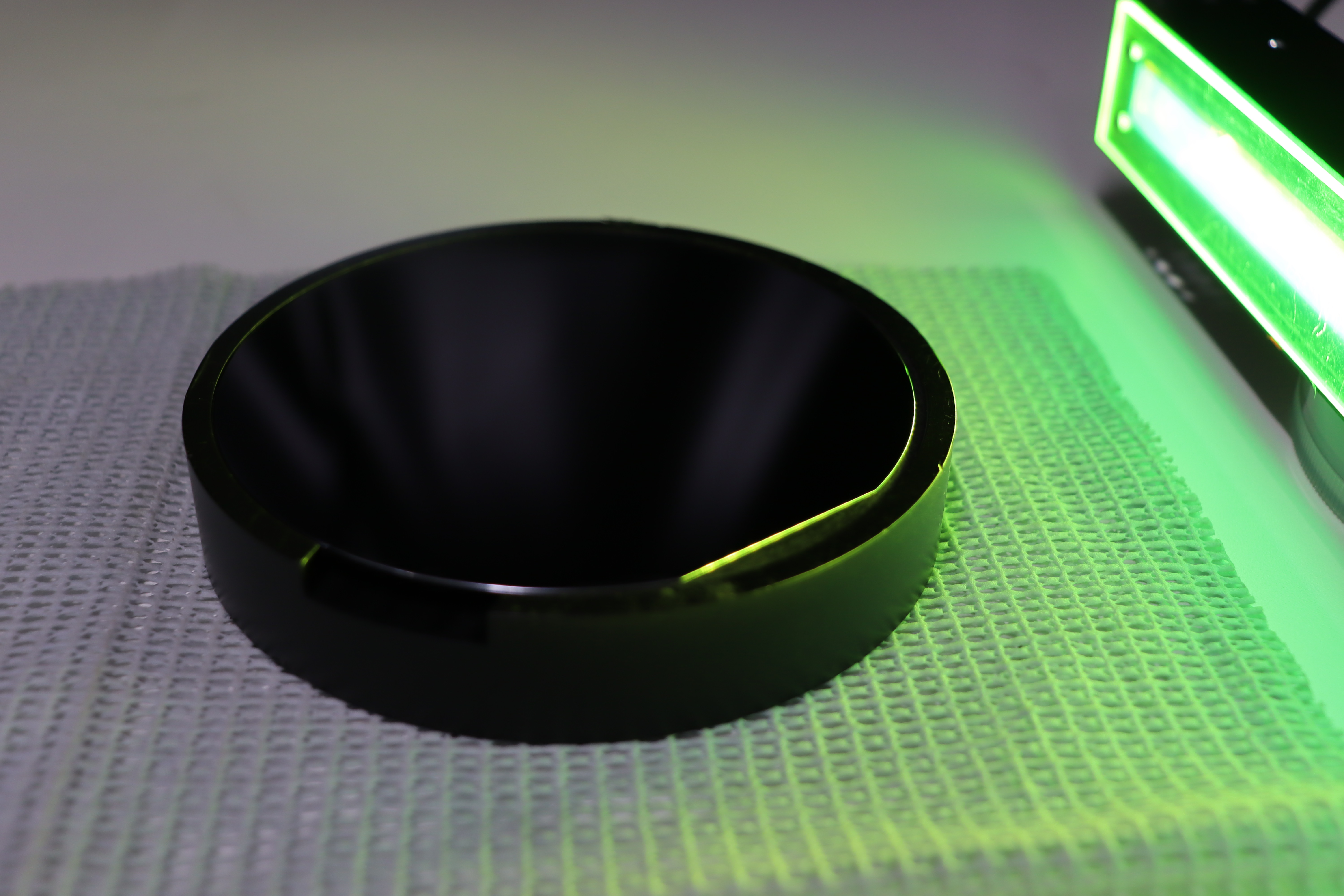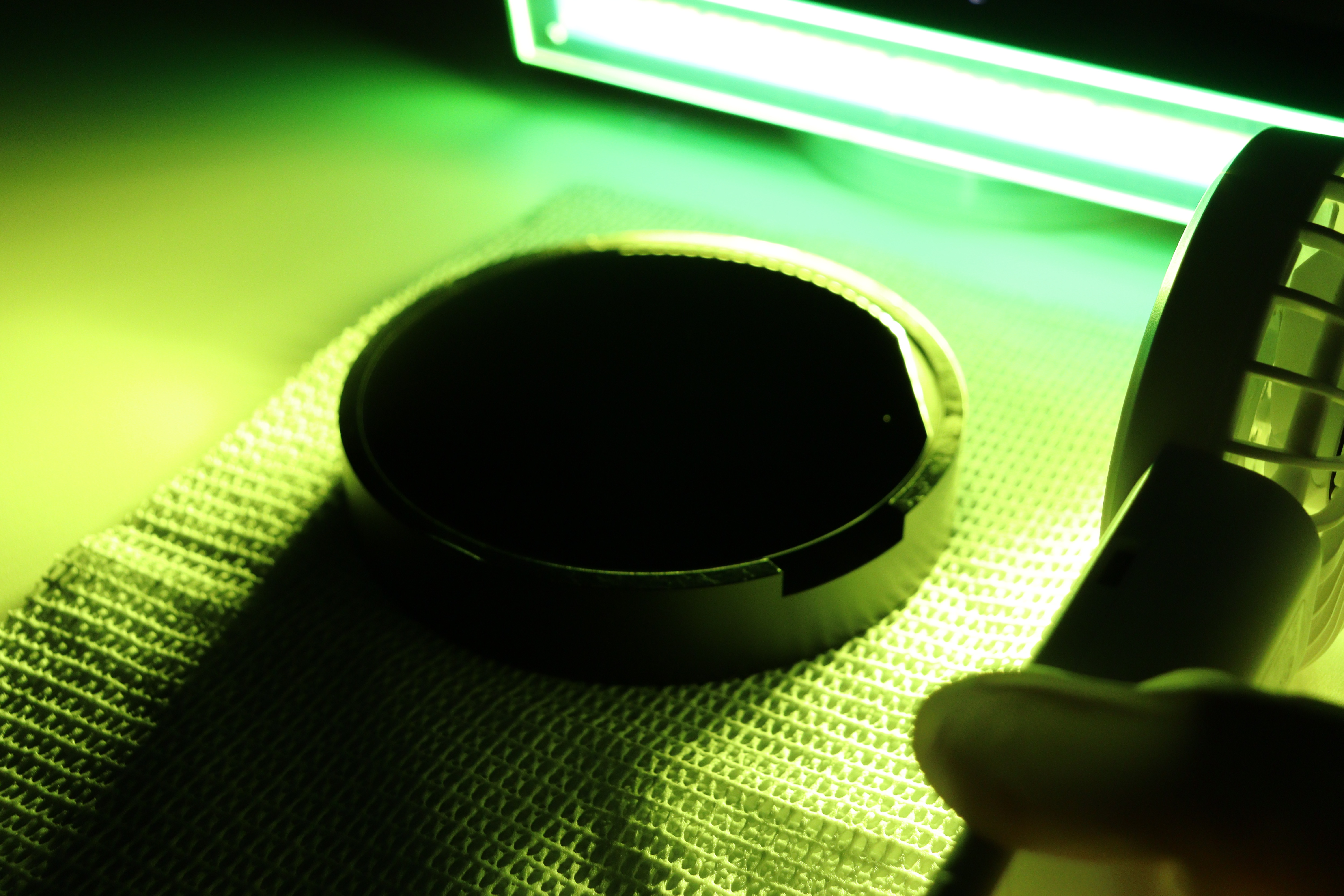 | ⑤ダストファインダーで照射したままハンディファン(弱、風速約2.5~3m/sec)で約5cmの距離から風を当て、落下した塵埃が飛んでいくのか動画で撮影する。 | |