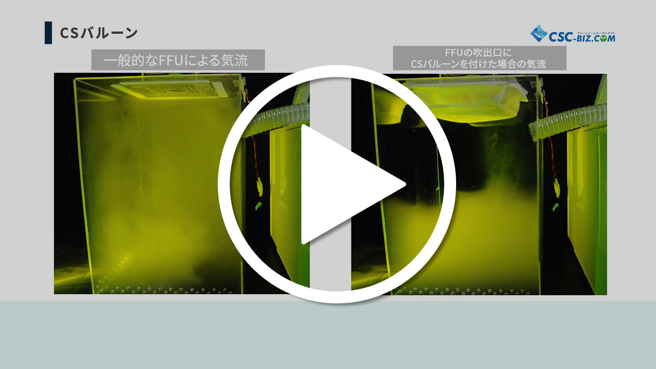 | クリーン化に重要なのは「気流」です。フィルターを通過したクリーンエアであっても、風量が多すぎると乱流となり床面からの舞い上がり気流を引き起こし、異物を拡散させる恐れがあります。作業時に風を感じるようであれば、乱流が発生している可能性が高いです。そのような状況には「CSバルーン」が救世主となります! CSバルーンとはポリプロピレン製のメッシュ生地でできていて、FFUの振り出し口を覆うように取り付けて使います。 クリーンエリアの理想的な気流は、広い面積からゆっくりと均一に吹き出す「層流性気流」です。CSバルーンを設置すると、その理想的な気流を実現させることができます。 今回、ミニブース内で気流を可視化しCSバルーンの効果を可視化しました。 ▼CSバルーン 【使用機器・備品】 ・CSバルーン ・気流可視化装置ミストストリーム CSC-MS002 ・クリーンルームライトミニN ・小型気流確認検証機 |