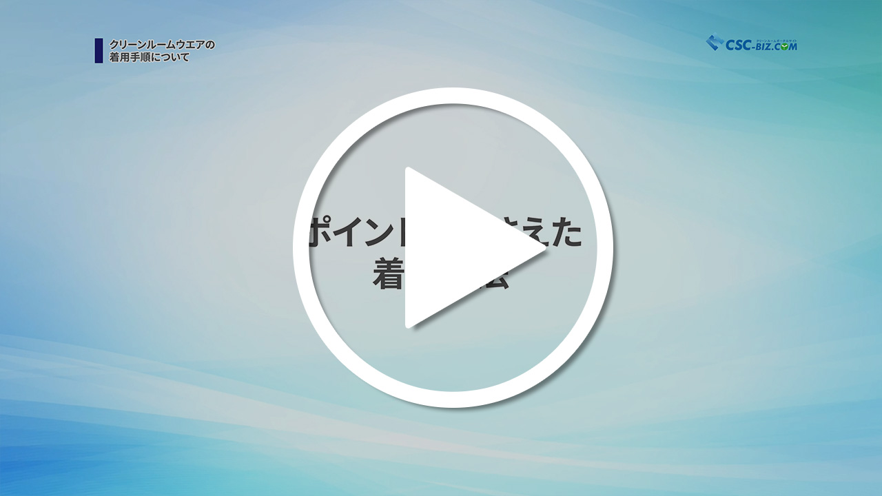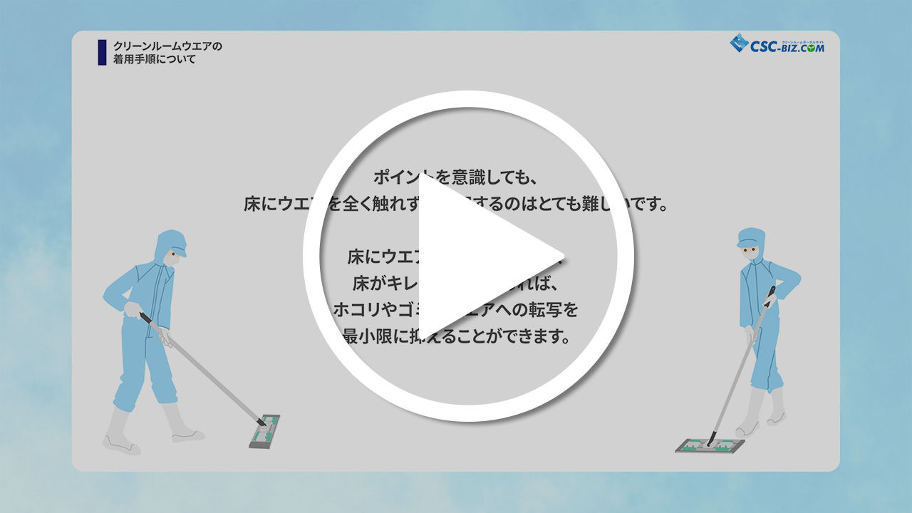 ※動画は音声付きです。 クリーンルームウエアはつなぎタイプが一般的で、着用の際どうしても袖や裾が床に付いてしまいます。床に堆積している埃やゴミがウエアに付着してしまうリスクがあります。 <ポイントをおさえた着用方法> ※動画は音声付きです。 ポイント①:ウエアを床に触れない位置に持ちます。 ポイント②:長さのある袖先を片手にまとめて持ちます。 ポイント③:ズボン裾をできるだけたくし上げ、裾が床に触れないように着用します ※クリーンウエアを床に触れさせないことを意識して着用します。 ポイントを意識しても、床にウエアを全く触れずに着用するのはとても難しいです。 床にウエアが触れたとしても、床がキレイな状態であれば、ホコリやゴミのウエアへの転写を最小限に抑えることができます。 クリーンウエアの着用方法と合わせて、更衣室や前室等の床清掃についても見直しすることをお勧めします。