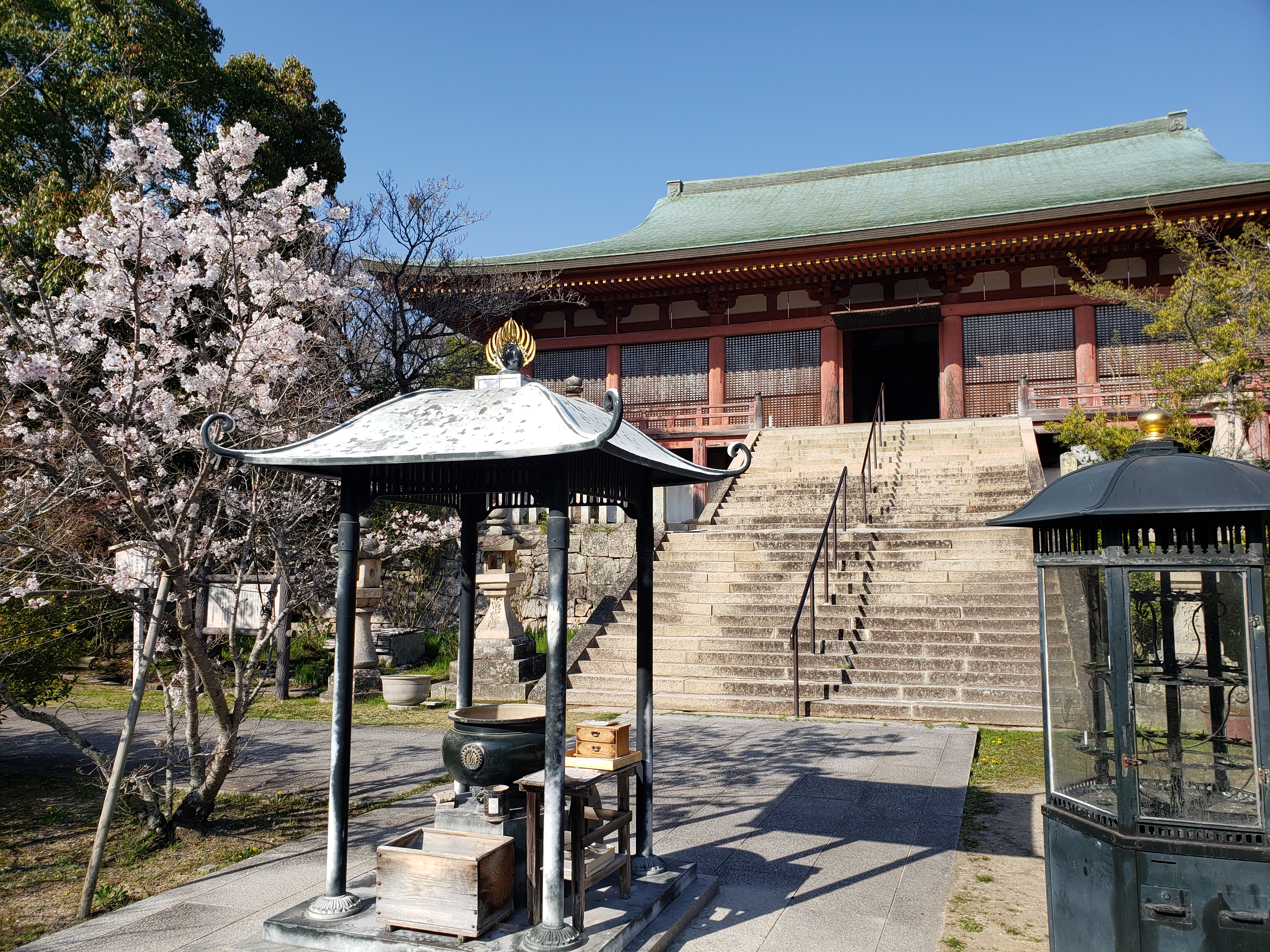 写真は兵庫県神戸市にある太山寺(たいさんじ)です。学生の頃に学校行事の写生会で訪れた時は秋だったのですが、今回は桜の時期に訪れました。石畳の参道を進むと右手に県指定文化財の三重塔があります。さらに正面には位置する朱塗りの本堂は国宝建造物に指定されています。ても閑静な場所にあり参拝客も少なくゆっくりとした時間が過ごせます。 |