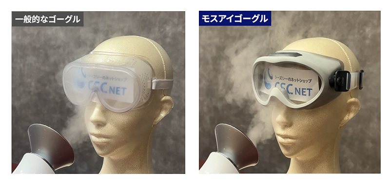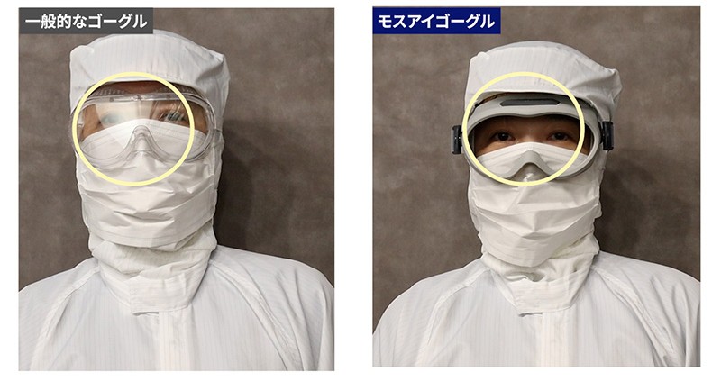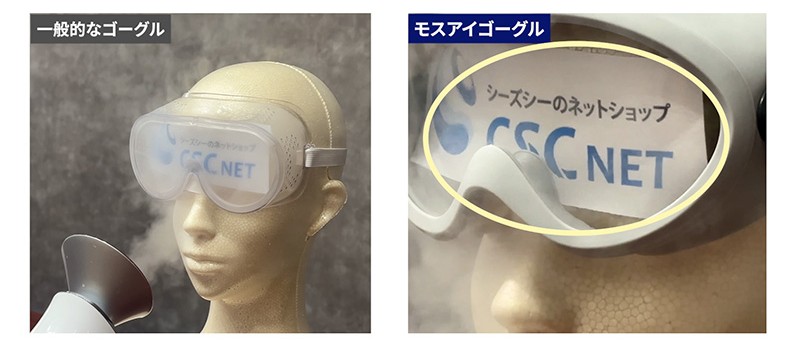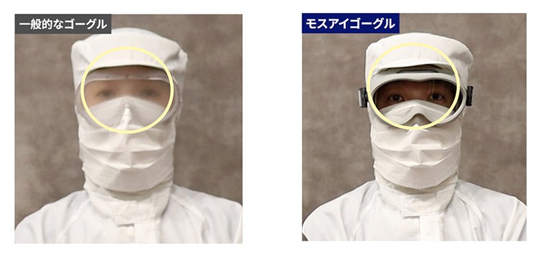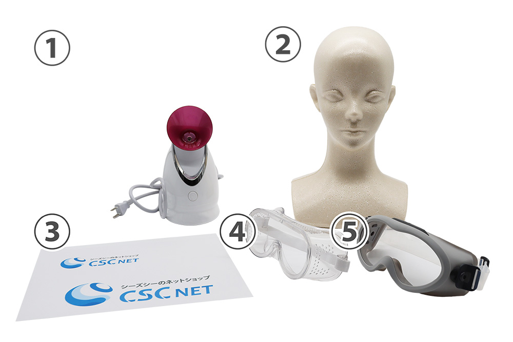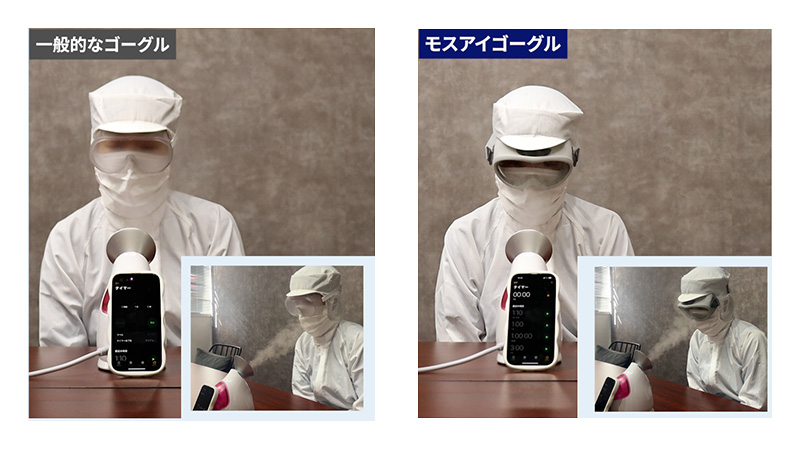 | 【使用機器・備品】 ①フェイススチーマー(蒸気噴射用) ②マネキン ③A4普通紙(ロゴ印刷) ④一般的に購入可能なゴーグル ⑤モスアイゴーグル|バックル付バンド付(型式:RM1941) <被験者着用アイテム> ・クリーンルームウエア ・クリーンフード ・マスク |