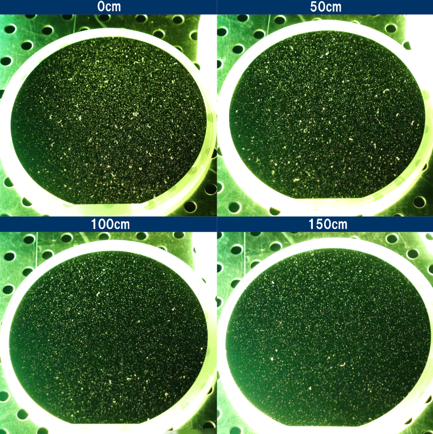 【考察】 実験の結果、床に置いたウエハ(0cm)が最も塵埃の蓄積量が多く、高さが高くなるにつれて蓄積量は減少する傾向が確認されました。つまり「ゴミが一番溜まった高さ」は床付近という結果です。5日目の蓄積塵量を比較すると、最も多かった高さ0cmと、最も少なかった高さ150cmでは、粒径150μmの粒子で10倍以上の差が生じました。 また、最も差が小さい粒径30μmにおいても、約2.7倍の差が確認できます。 ---------------- 高さの目安(成人男性・身長170cmの場合) ・0cm:地面 ・50cm:膝位置 ・100cm:腰位置 ・150cm:肩位置 ---------------- これらの結果から、通常環境下では、床に近いほど塵埃が蓄積しやすく、高い位置ほど蓄積しにくいことが分かります。一方で、クリーンルームの天井付近は、場所によって空調吹き出しからの早い風速により上昇する乱流が発生する場合があり、その影響で高さがあっても塵埃が舞い上がり、保管物に付着する可能性がある点には注意が必要です。 また、床に物品を直接置くことは、物品そのものへの塵埃付着だけでなく、清掃作業の妨げとなり、結果としてクリーンルーム全体の清浄性低下につながる要因となります。 弊社では清掃作業を円滑に行うために、すぐに移動が出来る キャスター付きラックなどで工夫しています。 年末年始で物品を長期間保管する際には、 「どの高さに置くか」も清浄性を左右する要素の一つとして、 本実験結果をぜひ参考にしてください。 | |