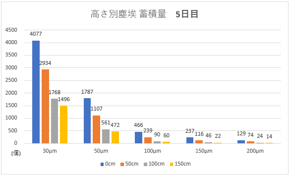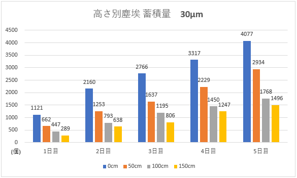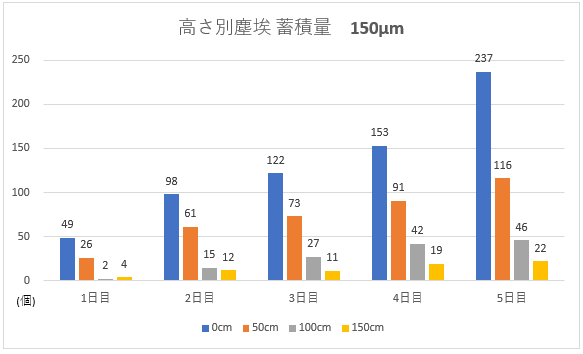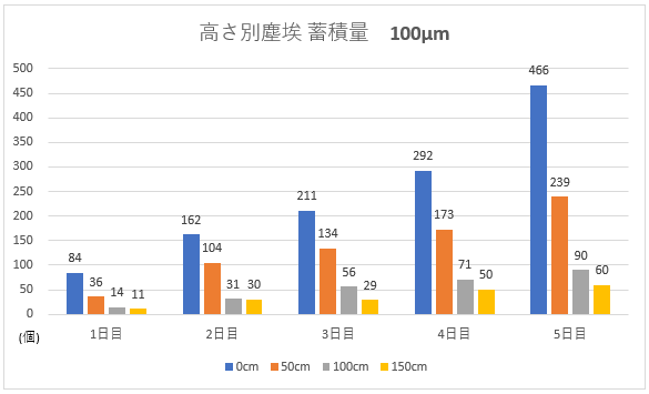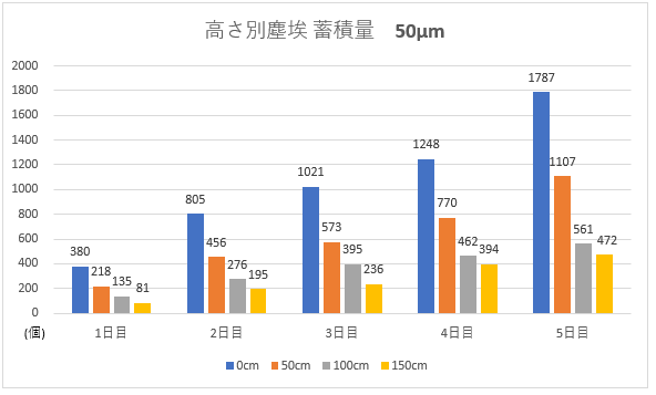 【実験方法】 [①]清掃したウエハを高さ別に暴露(床から0cm・50cm・100cm・150cm) 期間:5日間(9時-17時) 人が一番出入りする、オフィスの玄関にて実験を行いました。 [②]1日で溜まった塵埃の量を見る為、毎日(5日間)17時に①で暴露した各ウエハ上の塵埃量をRCAARで測定 【実験結果】 5日目塵埃蓄積量結果 |